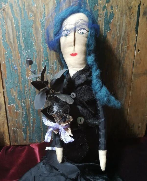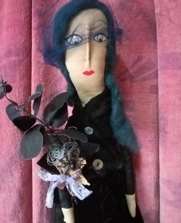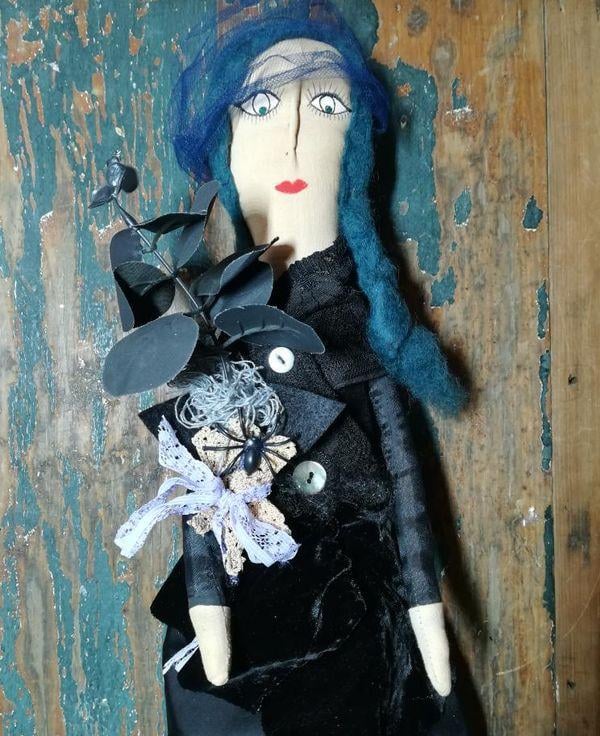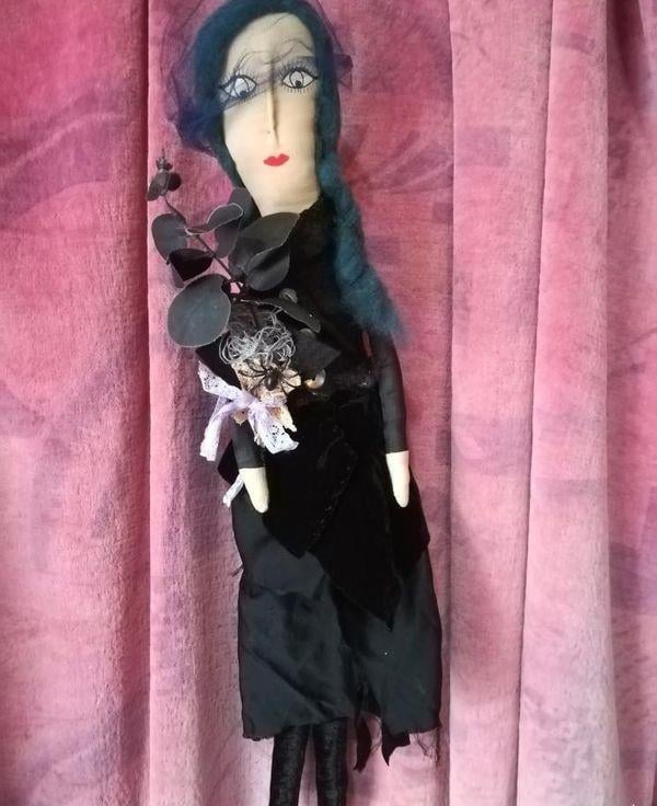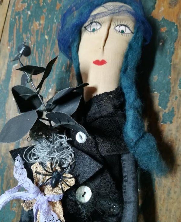 With flowing green wool top hair, a black Witchy outfit hand made using vintage black velvet and textile.