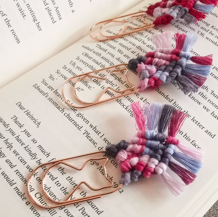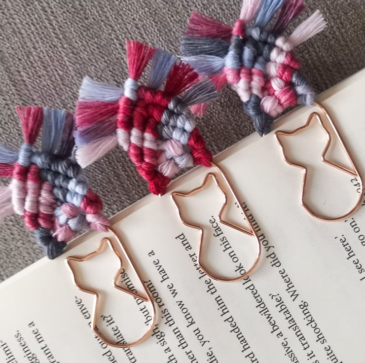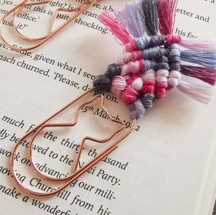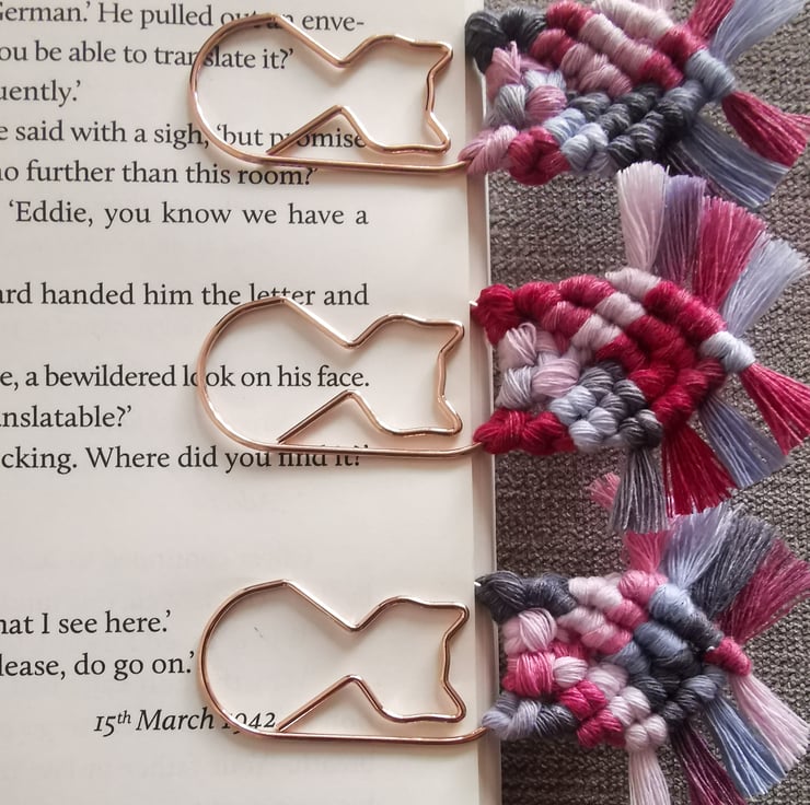 Set of 3 bookmarks on jumbo rose gold paperclips with shape of a cat.