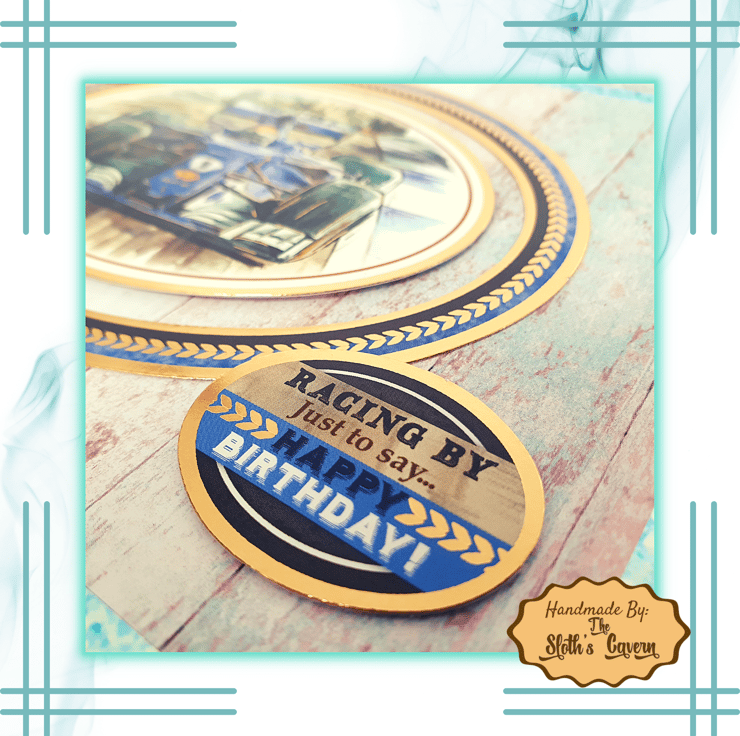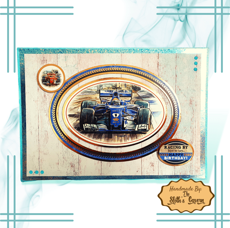 The white A5 card base has been decorated with sparkle spray in "Marine Mist" and layered with a 220gsm glitter ombre mirror card and paper in light wood-print. Three gold foiled toppers decorate the card. 1 large topper in the middle, displaying the image of a racing car and 2 smaller toppers, one with a picture of racing car, and the other with the sentiment "Racing By Just To Say Happy Birthday".