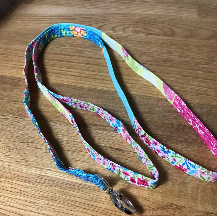 This lightweight lead is created using patchwork techniques from my offcuts. The result is a bright and happy lead that is best suited for small/lightweight pets. There is a single length of cotton tape sandwiched within the layers to give stability and strength. The material is then top stitched to give additional strength. The approximate length of the lead is 56.5" and the handle is 7".