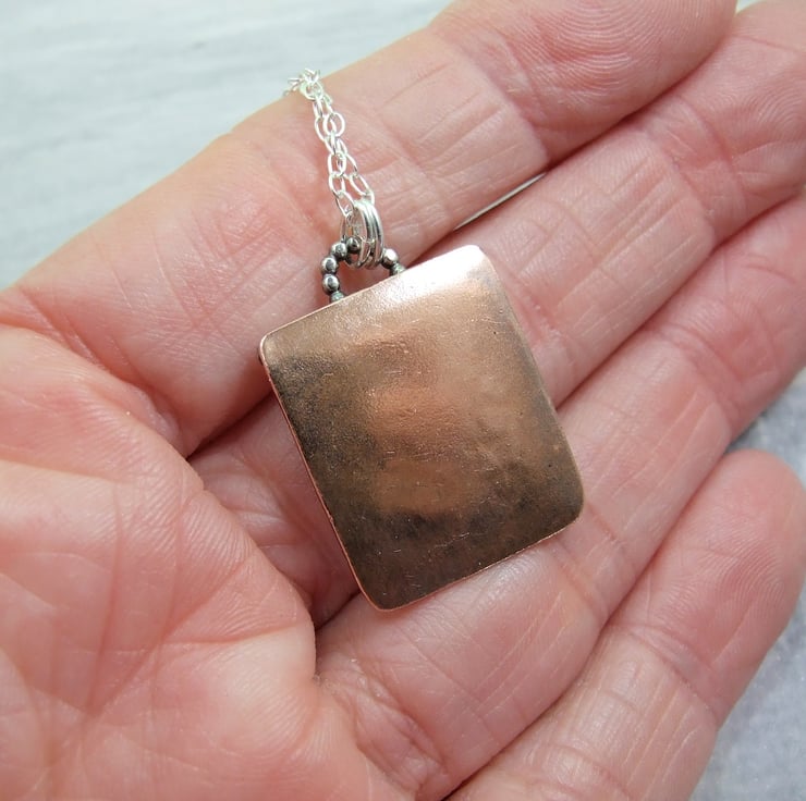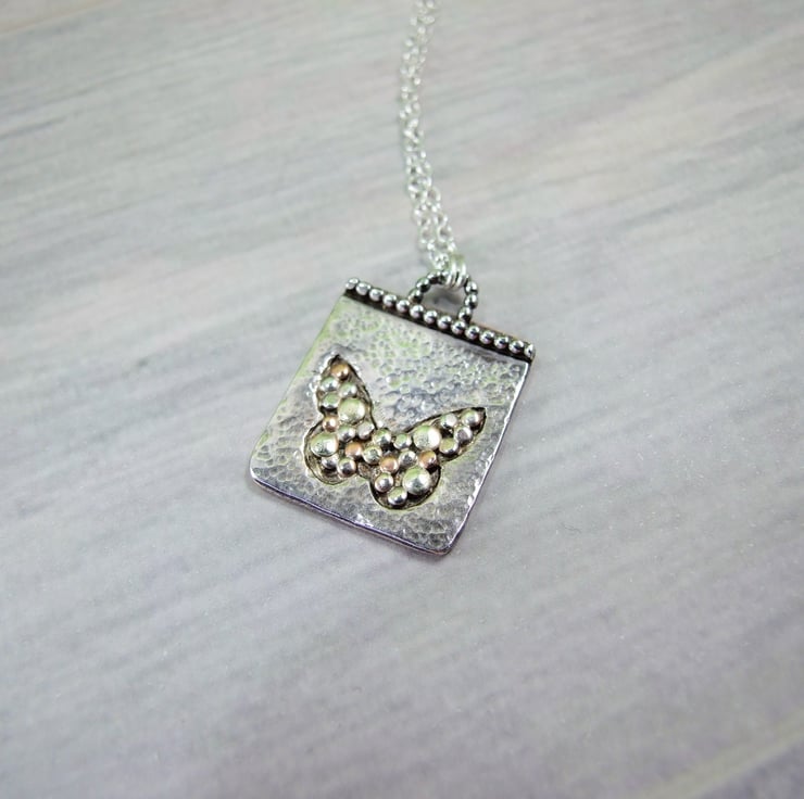 I have made the base from copper sheet which is overlaid with sterling silver sheet with a butterfly cut out. I have filled the butterfly shape with copper, silver and brass tiny beads all soldered securely in place. Fitted to 18 inch .925 Sterling Silver Chain.