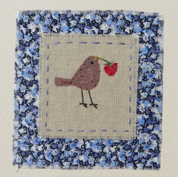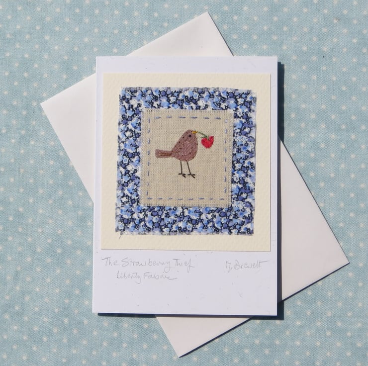A unique hand-stitched miniature applique with embroidered details. The little (female) blackbird is cut from my own hand-dyed cotton fabric, the central panel is stitched to a pretty Liberty of London cotton print with summer flowers. I have borrowed the title from William Morris, who designed a beautiful furnishing fabric called The Strawberry Thief.