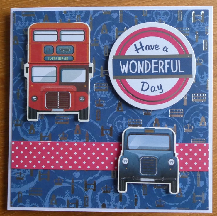 The card has been finished with a circular red, white and blue message reading 'Have a Wonderful Day' in a road/tube sign design.