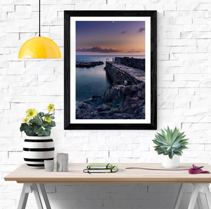 This wall art photo was taken just after sunset during blue hour and shows the tiny quayside of Portwrinkle Harbour in Cornwall. This part of the south east Cornish coastline has lots to offer the photographer and is one of my favourite places. The setting sun has left a lovely orange glow on the horizon and compliments the deep blue of the evening. The crescent moon just adds a nice touch!