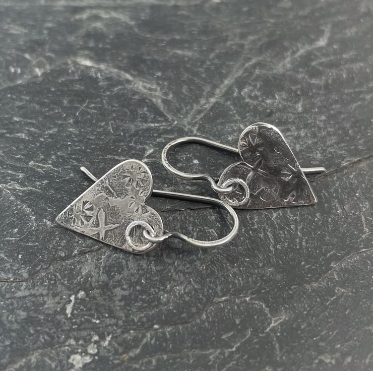 Small lightweight oxidised silver heart earrings, textured with a “firework” pattern.