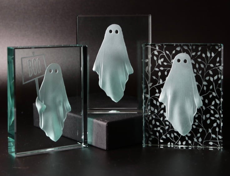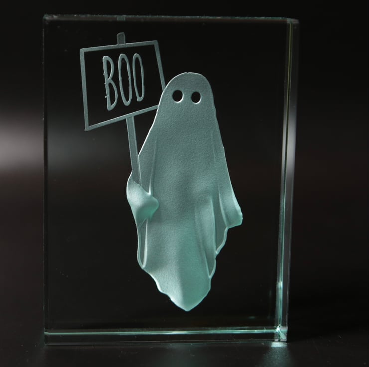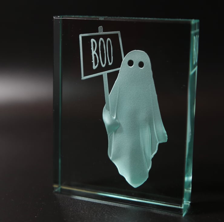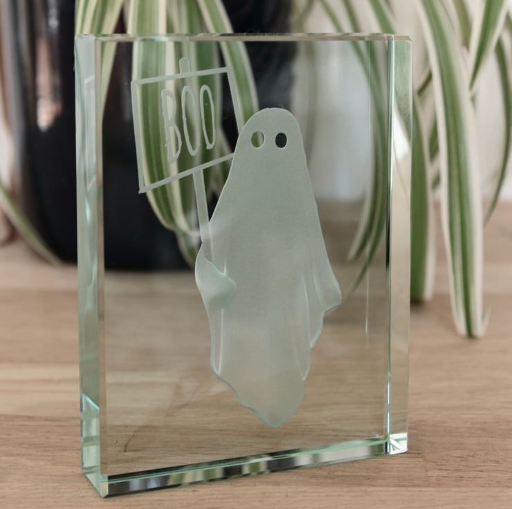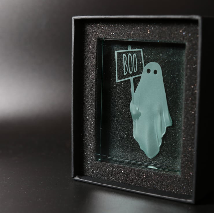 This jade glass block is 7.5cm wide, 10cm high, a depth of 1.8cm and weighs approximately 370g. Your ghost is deeply etched into the glass giving it a hauntingly beautiful appearance. These stunning ghosts are sandblasted individually so no two will ever be exactly the same and you will own a truly unique little sculpture. They come in a black foam lined gift presentation box and postage and packing is free within the UK.