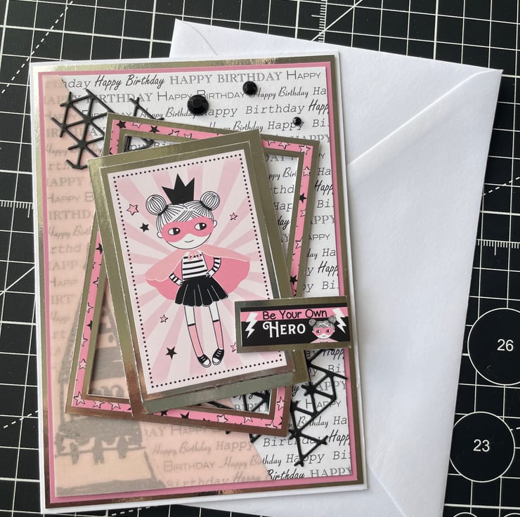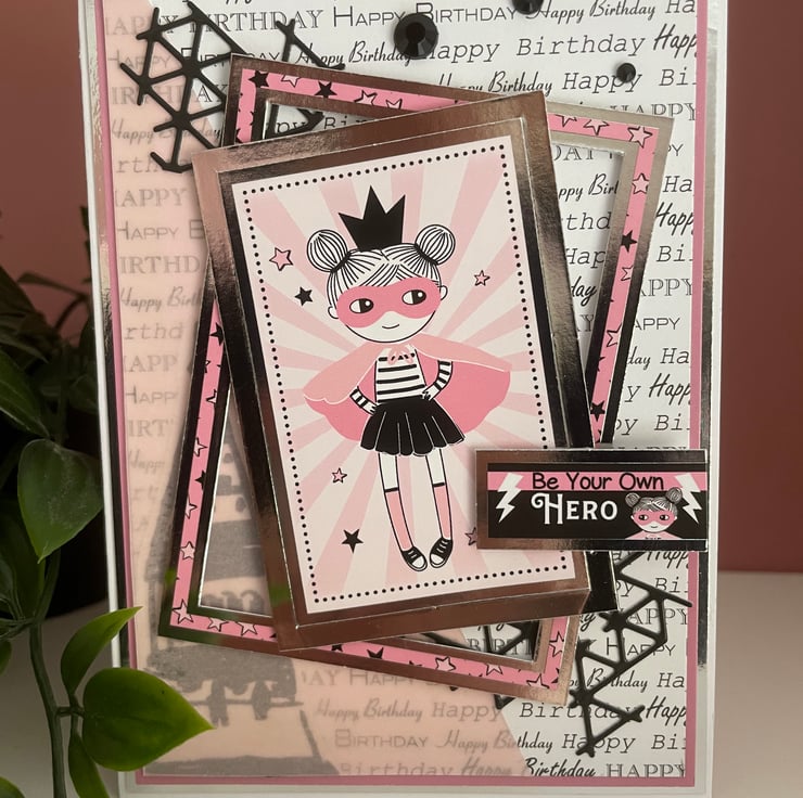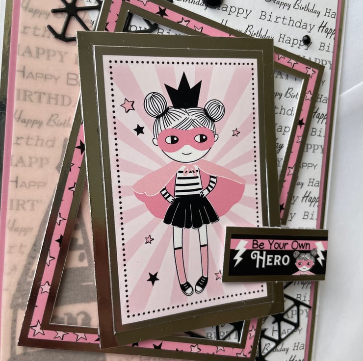 A perfect card for a loved one celebrating a birthday. I made this unique hand made card with pink lovers and superhero lovers in mind. The white card is approximately 6x4 inches in size. The card has been made using quality card stock and toppers from a Hunkydory collection. The sentiment on the card is “Be your own hero ”. There is also happy birthday card stock in the background.