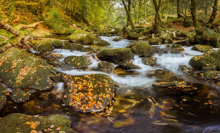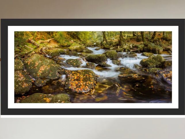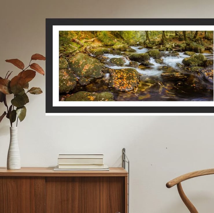 A photo print taken as a panorama at the beginning of Autumn showing the River Meavy as it flows towards Shaugh Prior on the edge of Dartmoor. This location is a favourite and I visit at all times of the year. It is a very popular place especially in the Summer and at holiday times so if you want to take photographs you have to pick your days carefully.