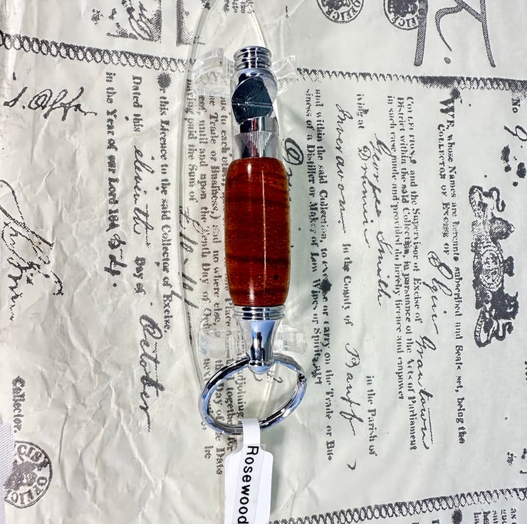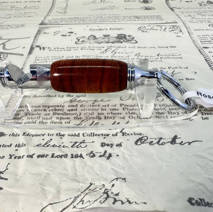 This is a Chrome Keyring Bottle Opener with a Bolivian Rosewood body finished in a solid lacquered coating.