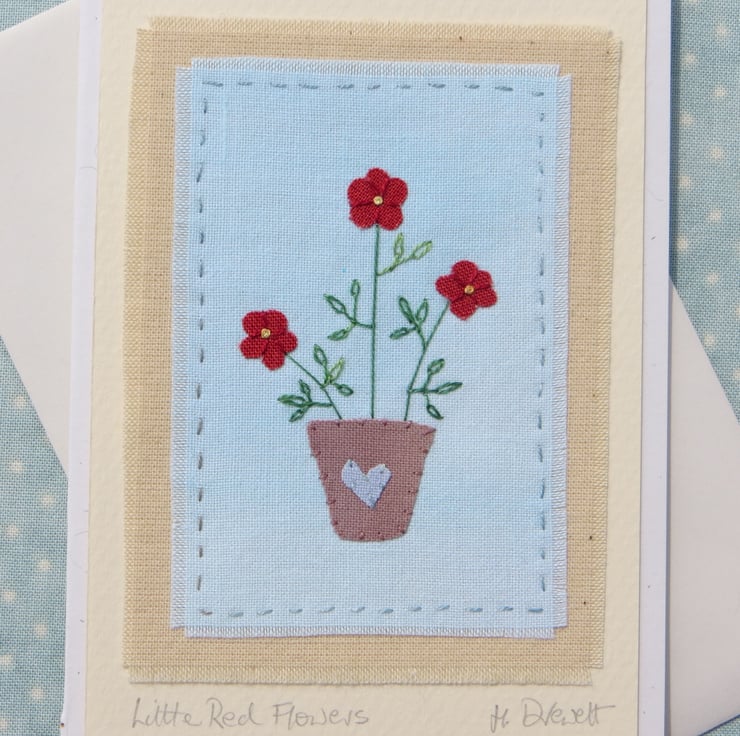 This is a small handmade greeting card featuring a miniature applique pot and flowers with the addition of hand embroidered stems and leaves. Worked on a piece of my hand-dyed recycled cotton, a card to keep, suitable for almost any occasion!