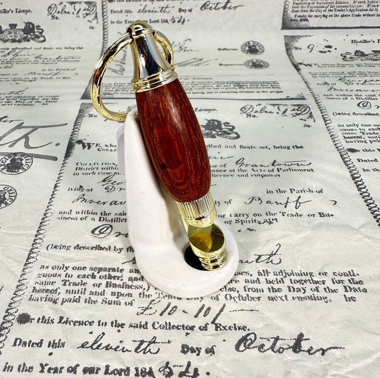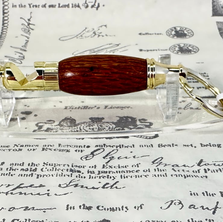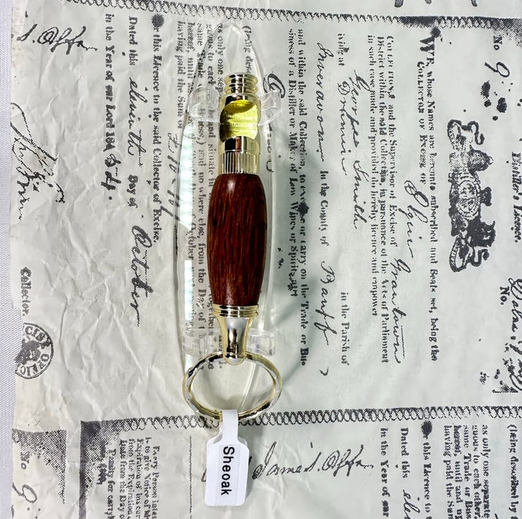 This is a Gold Keyring Bottle Opener with a Sheoak body finished in a polished coating. Sheoak is an Australian wood not commonly found outside of its native lands, they like to keep it to themselves. It isn't an oak either.
