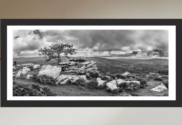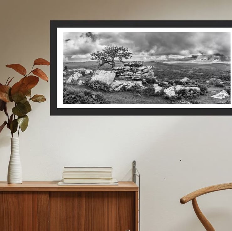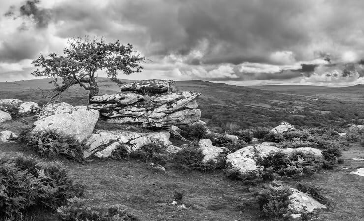This panoramic black & white photography print is a typical scene on Dartmoor. Taken from the top of Heckwood Tor, it looks out across the moors to the south. The Hawthorn tree seems to grow from the rock itself. Dartmoor could have been made for black & white photography. Wide open spaces and rugged granite tors are perfect subjects for this type of photograph.