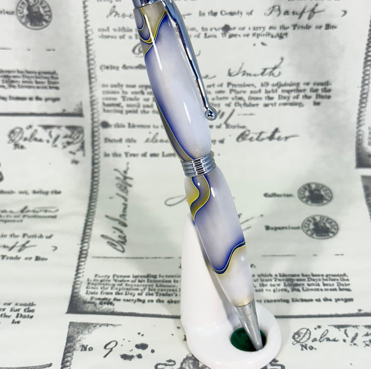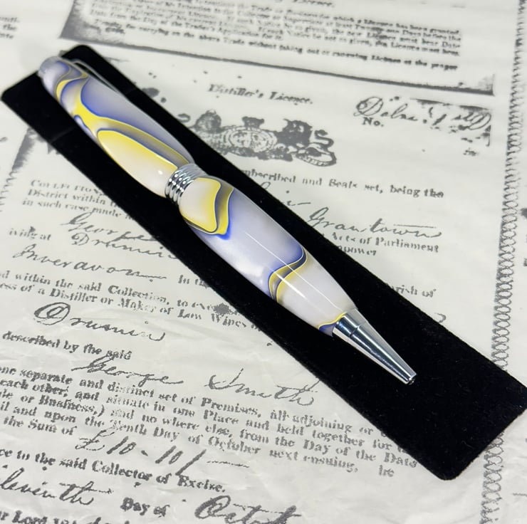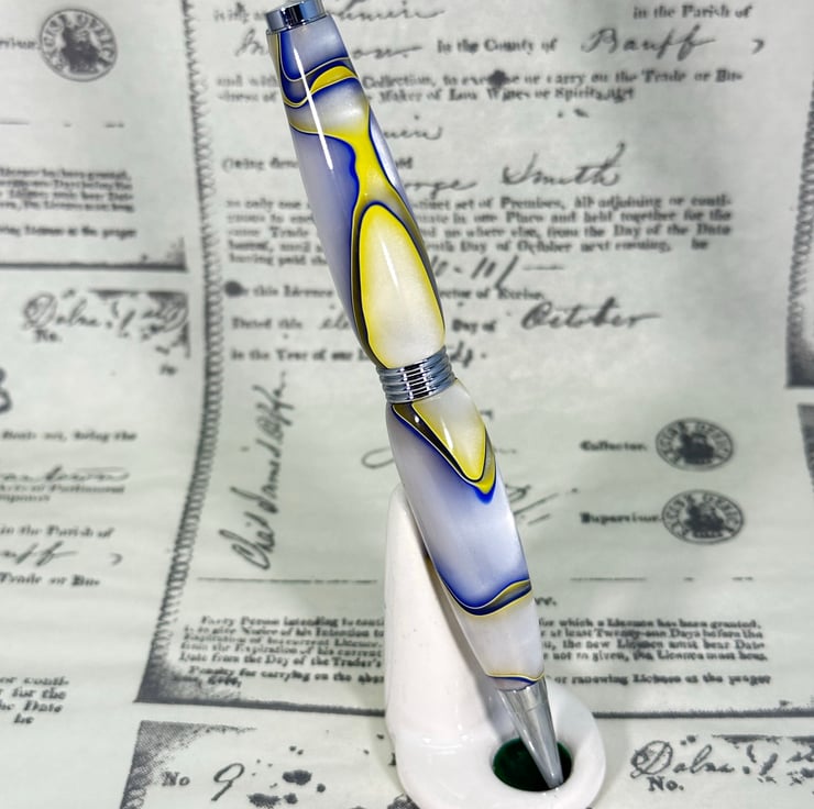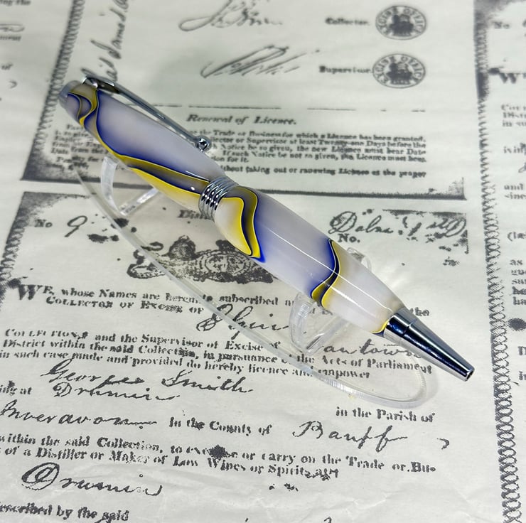 This is a Silver Streamline Twist Pen with a White, yellow and blue body finished in a polished coating; a stylish and easy to use pen due to its light weight and grip size.