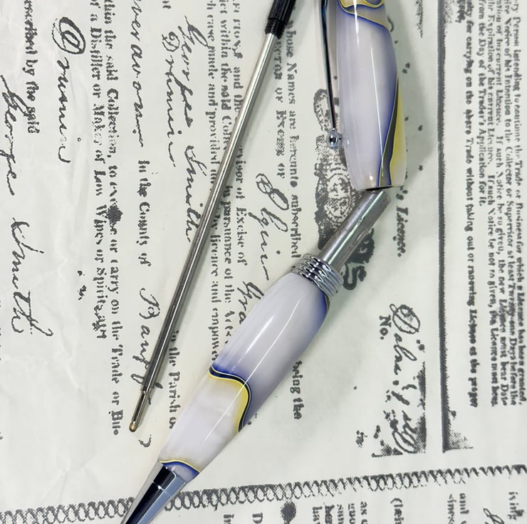This pen comes in a velvet sleeve. A black Cross style refill is included, but could be changed to blue or red if you so desire, and takes easily replaceable standard Cross style refills. To replace the ink, grasp the upper and lower pen sections and pull apart, you will see the plastic top of the refill. With a light pressure unscrew the old refill then screw in the replacement. When placing the upper and lower pen halves together ensure any grain of the wood or acrylic patterns line up before pushing the halves together.