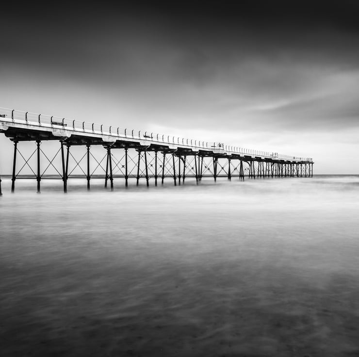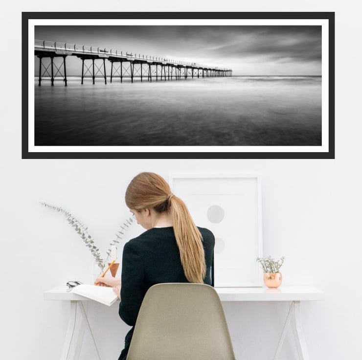 A minimalist print of a long exposure black & white panoramic photo of the iconic Victorian pier at Saltburn-by-the-Sea on the North Yorkshire coast. The pier has been shortened twice. Once by a storm and again by a ship colliding with it in the fog.