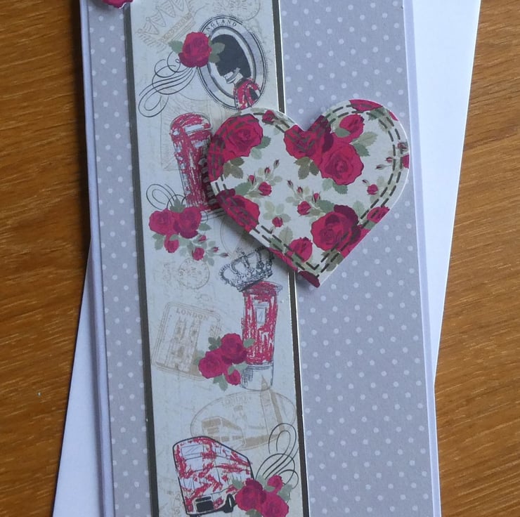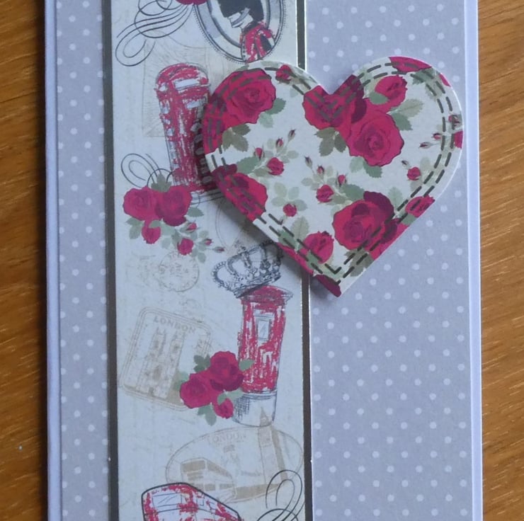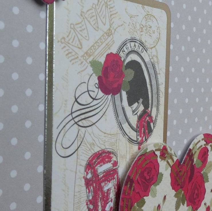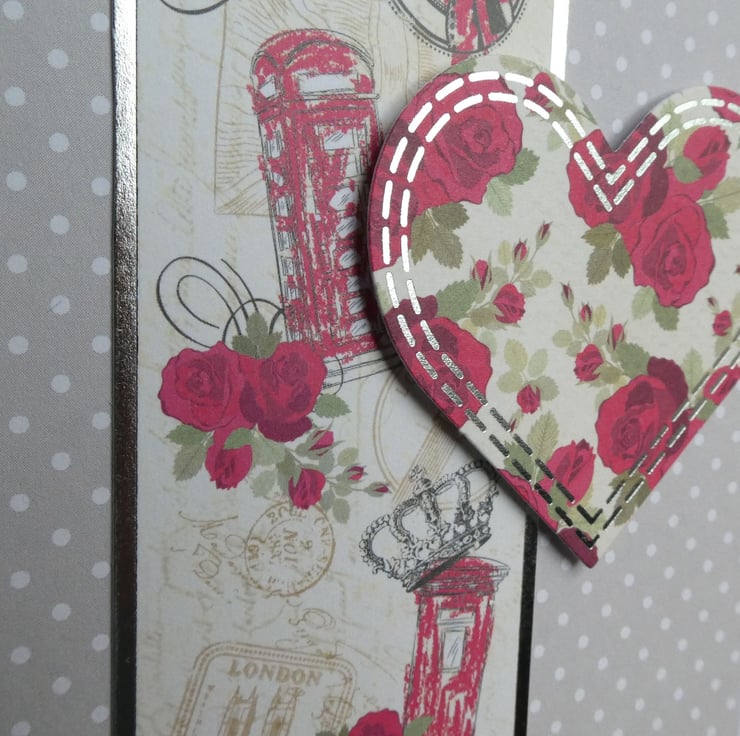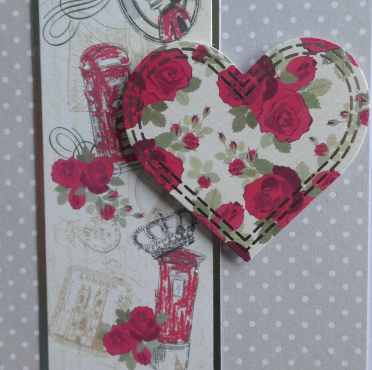 Two die cut red roses and a floral cream and red heart have been added to complete the design, this has been raised on foam pads for further interest.