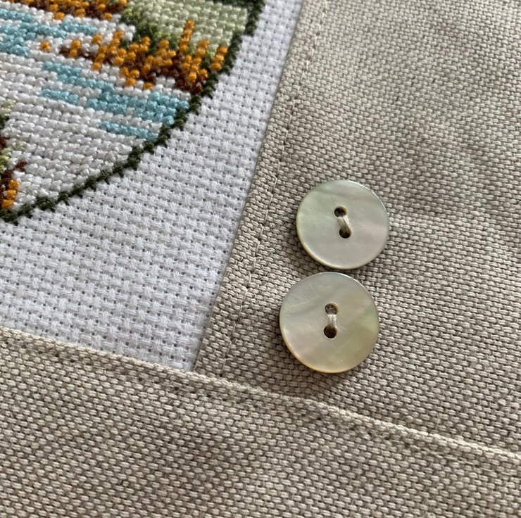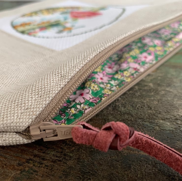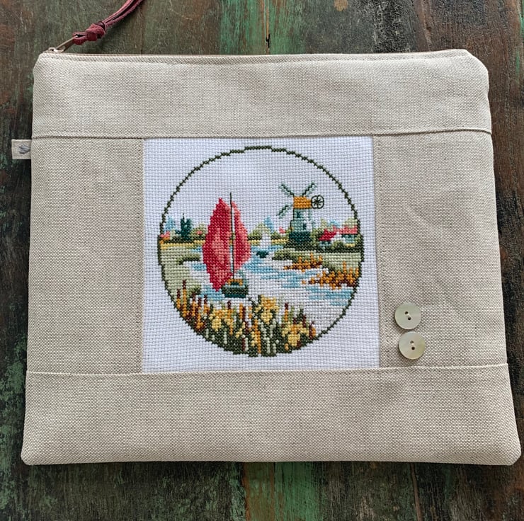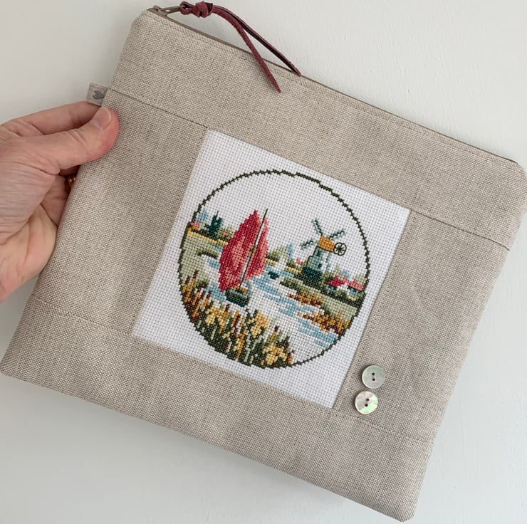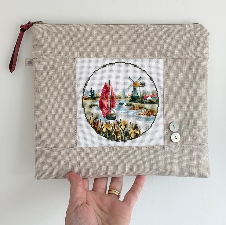 One of a kind large zip pouch in natural linen with a beautiful cross stitched panel of a boat sailing past a windmill. The pouch is fully lined with reclaimed ditsy floral cotton from a Zara skirt. A layer of interfacing gives some protection to the contents. It is finished with mother of pearl buttons.
