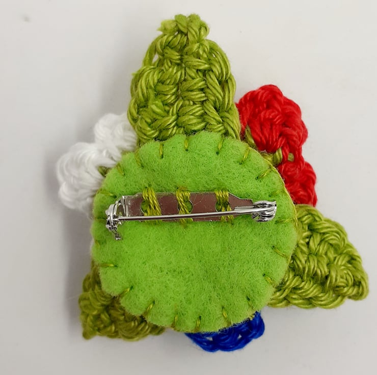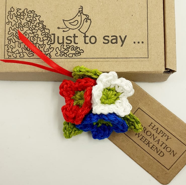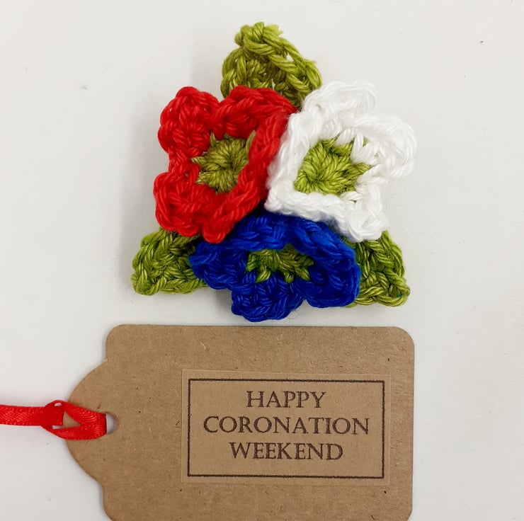 This pretty brooch in patriotic colours would be perfect to wear over the Coronation weekend and a sweet momento of the occasion afterwards. The flowers and leaves are crocheted in cotton and they and the metal fastening are hand sewn to a stiffened felt backing. The brooch measures approximately 5cm in diameter and is attached to a tag which reads Happy Coronation Weekend, although I am very happy to exchange this tag for one with wording of your choice. Tge brooch comes wrapped in tissue in a labelled PIP ( Postage in Proportion) box all ready to be gifted or posted on if required.