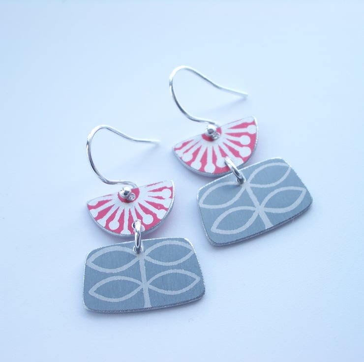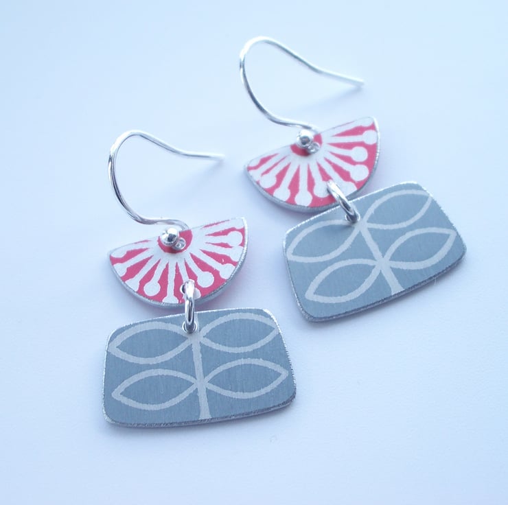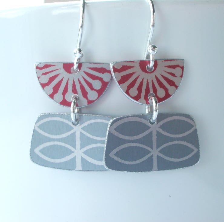These mid century style earrings are made from anodised aluminium which I have dyed in red and grey and printed with a starburst and leaf design. I hand cut the rectangle and semi circle shapes by hand using a jeweller's piercing saw and file the edges to give a nice smooth finish. They dangle from sterling silver jump rings and hang from sterling silver ear hooks. The earrings measure approximately 20mm x 20mm.