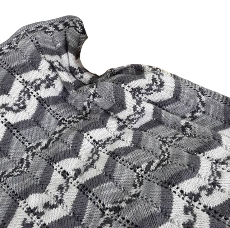 The mesmerizing chevron knit pattern not only provides a delightful visual appeal but also offers a gentle texture for your baby to explore, adding an extra layer of comfort. The self-patterning Aran yarn beautifully highlights the intricate chevron design, showcasing the various shades of grey and white.