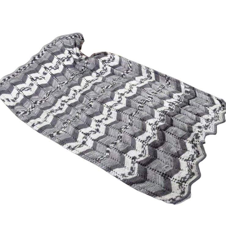 Hand-Knitted Baby Pram Blanket in a sophisticated palette of soothing baby grey and crisp white, featuring an enchanting chevron pattern. Crafted with utmost care and love, this blanket is an exquisite piece designed to keep your little one snug and cosy in the pram, crib, or during cuddle time.