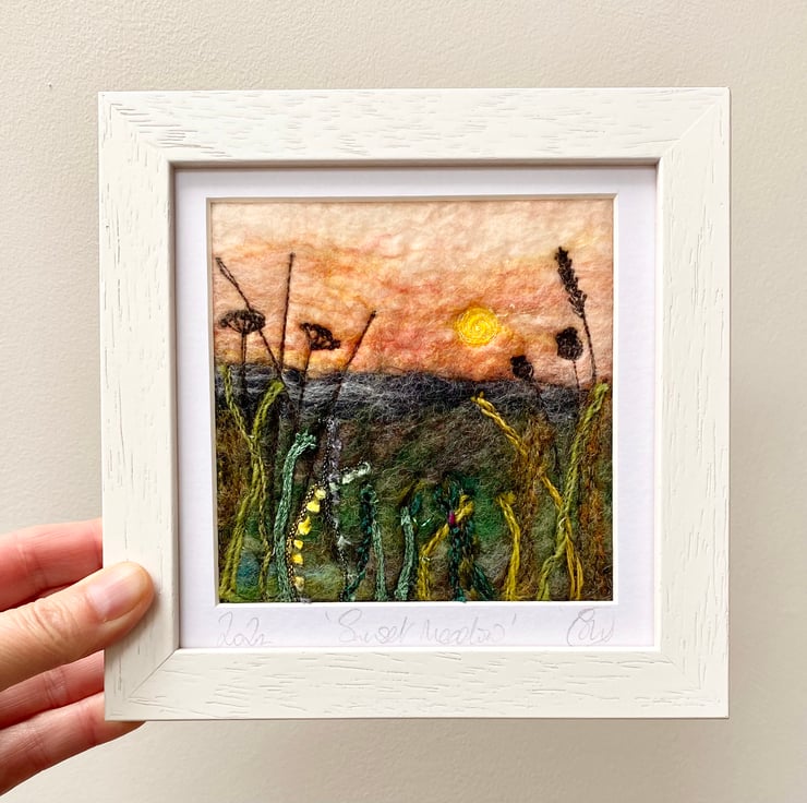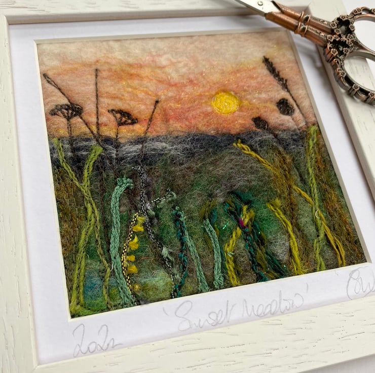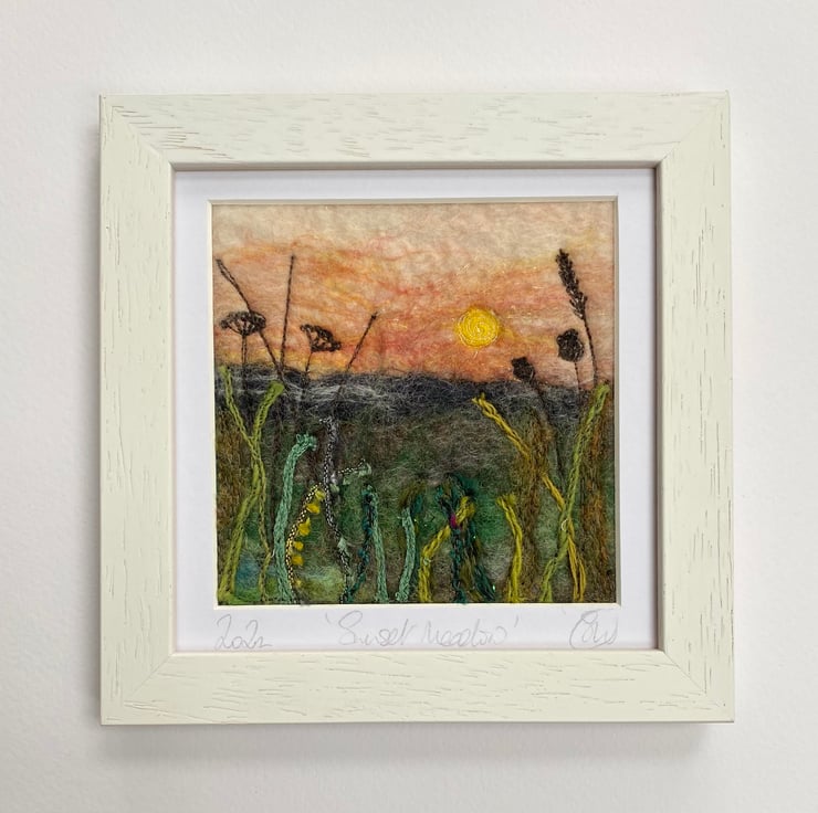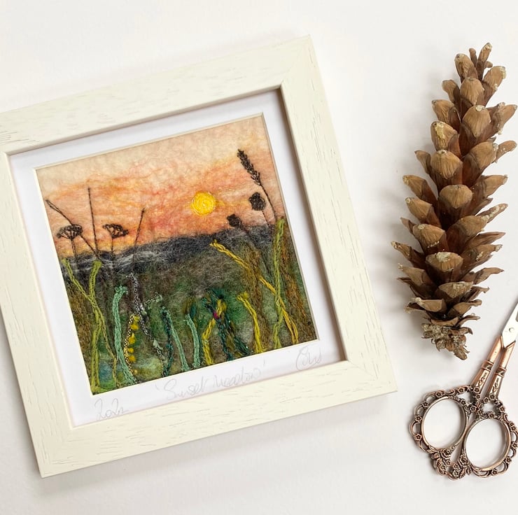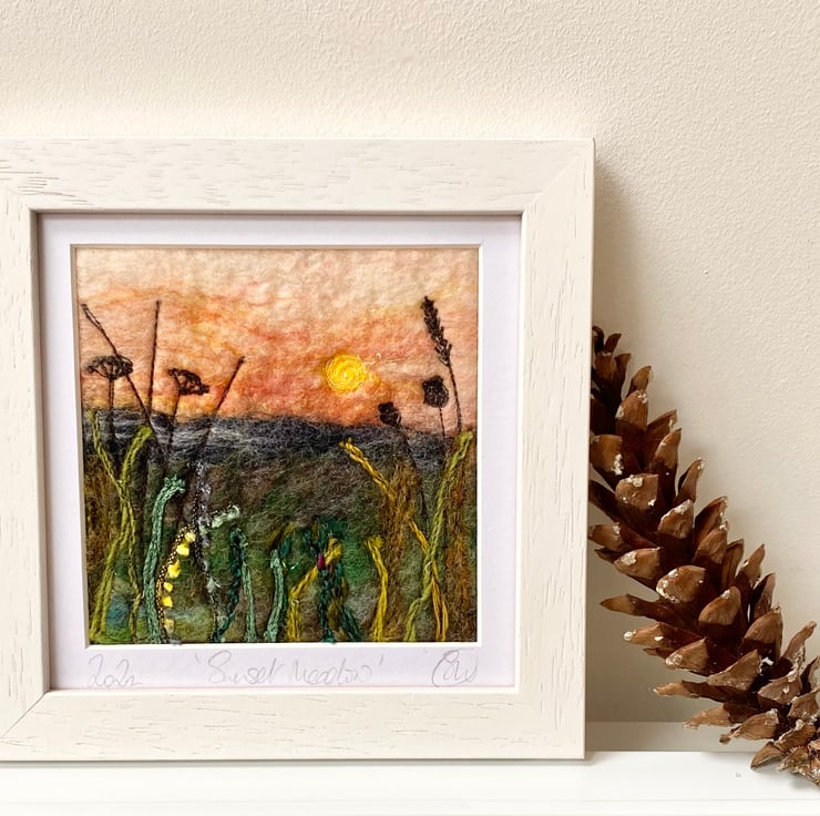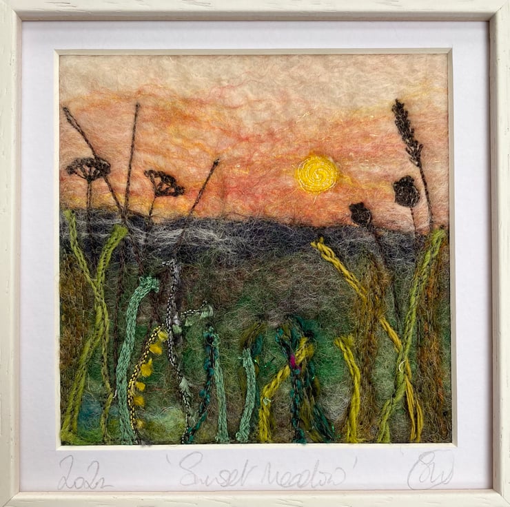 This delightful textured piece is based on my hedgerow series. It shows a sunset scene with grasses and plants in silhouette in the foreground. It’s a wet felting and embellished with free motion embroidery.