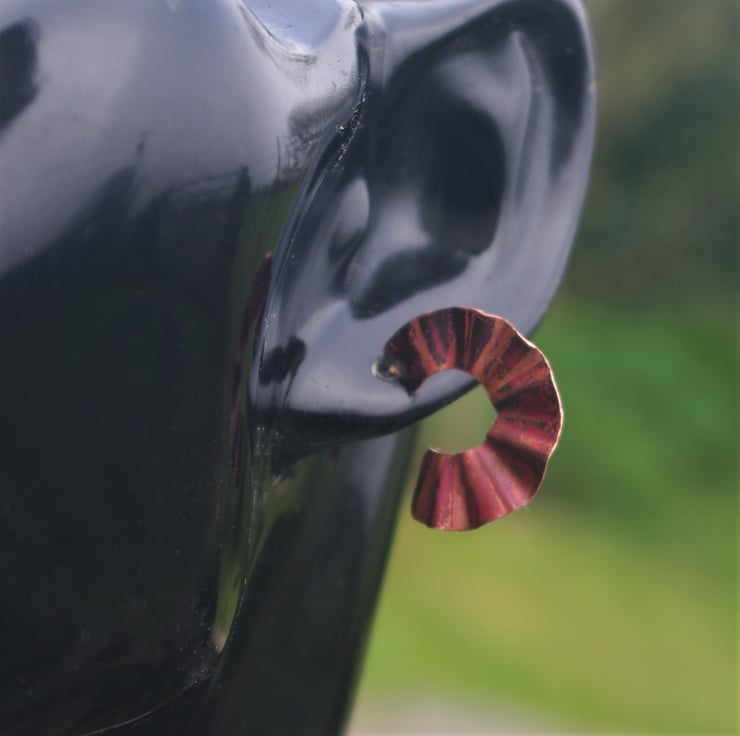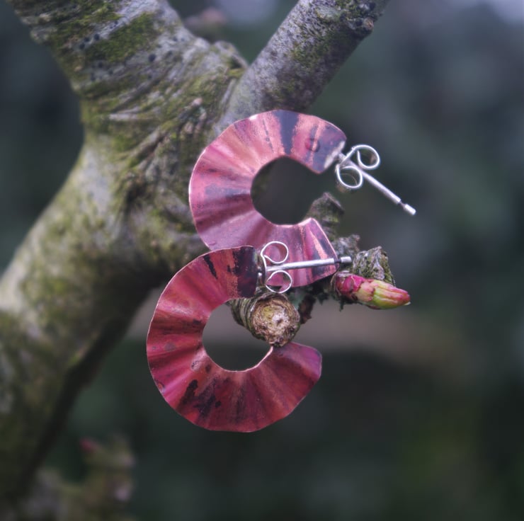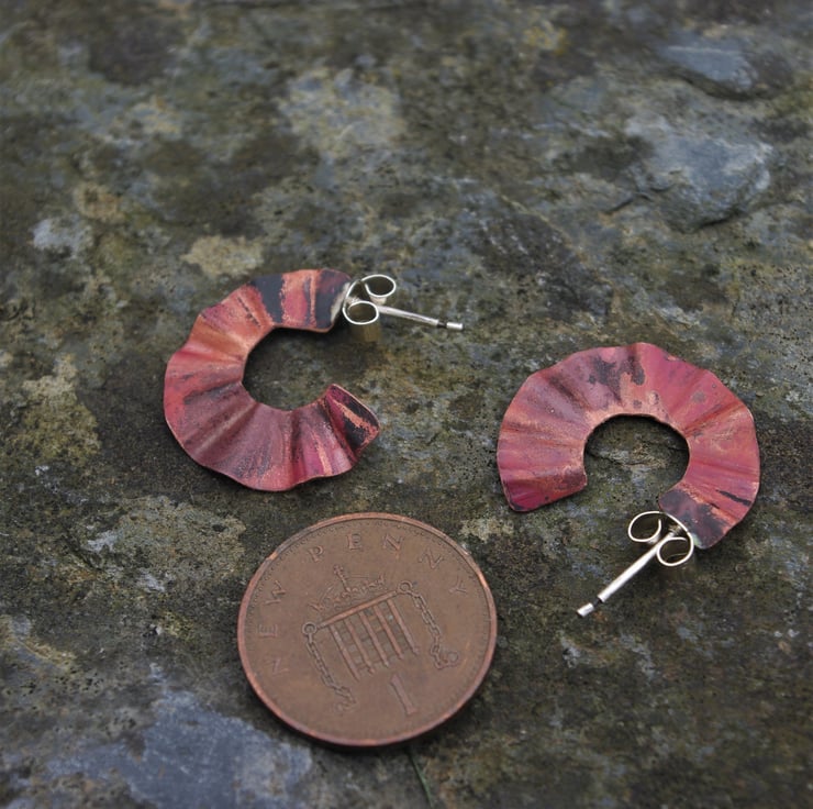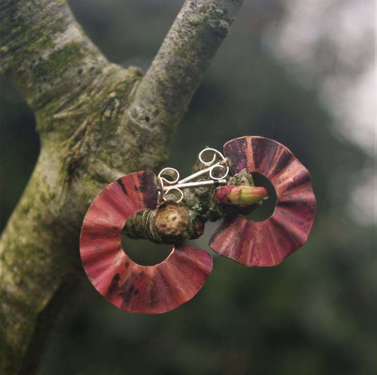Simple copper circular stud earrings; a twist on a hoop earring . I have cut the circular shaped from flat recycled copper sheet and given them a wavy surface. The different copper and red tones are achieved through heat. The diameter is 22mm/ just over 0.75 inches, which is the length of the earrings . The end of the curve tucks under the earlobe , designed so that it appears that they form a circle into the back of the ear.