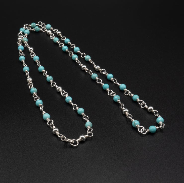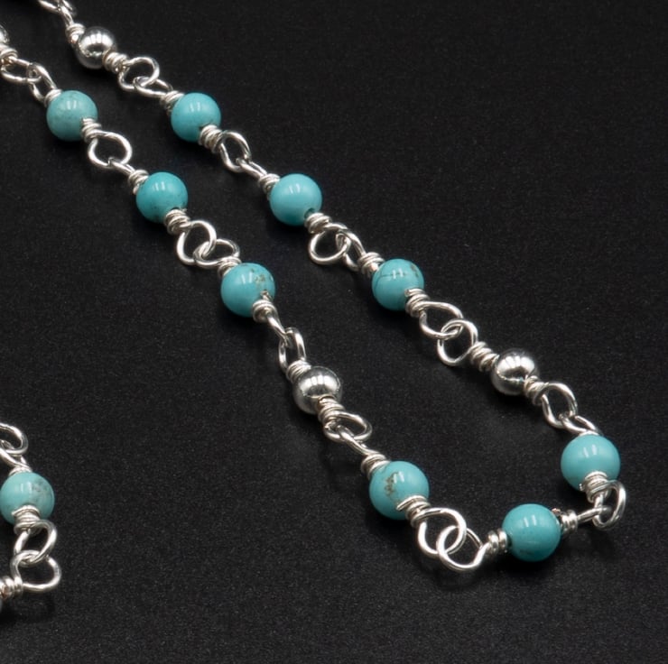 Turquoise howlite 4mm beads and silver filled 3mm beads are individually liked with silver filled wire to create the necklace chain. The necklace fastens with a silver filled spring ring clasp and handmade ring.