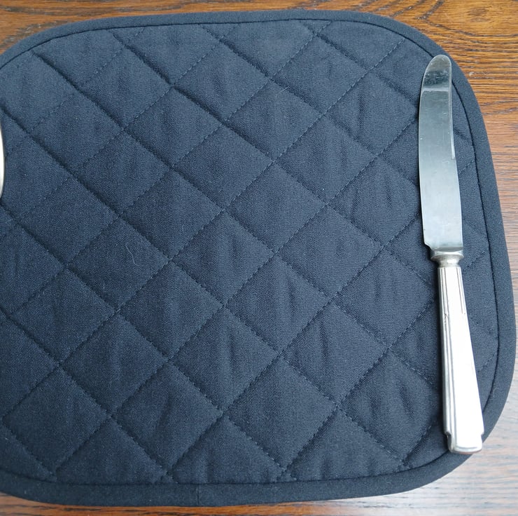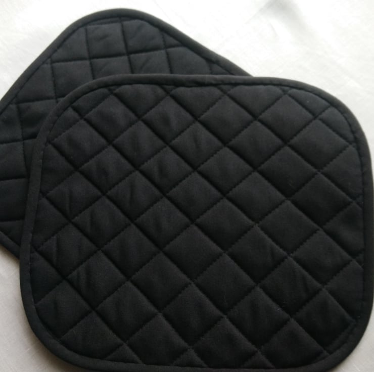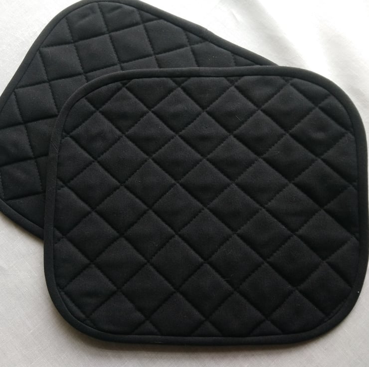 Placemat, Quilted Heat Resistant made in 100% Black Hotel Quality Cotton Fabric. The black fabric is the same both sides and the binding is handmade from the same fabric. They are jet black in colour, although a close up of one of the images looks a bit grey They have 2 layers of Heat resistant Wadding inside. The Binding is hand sewn on the reverse side. Made to a very high standard.