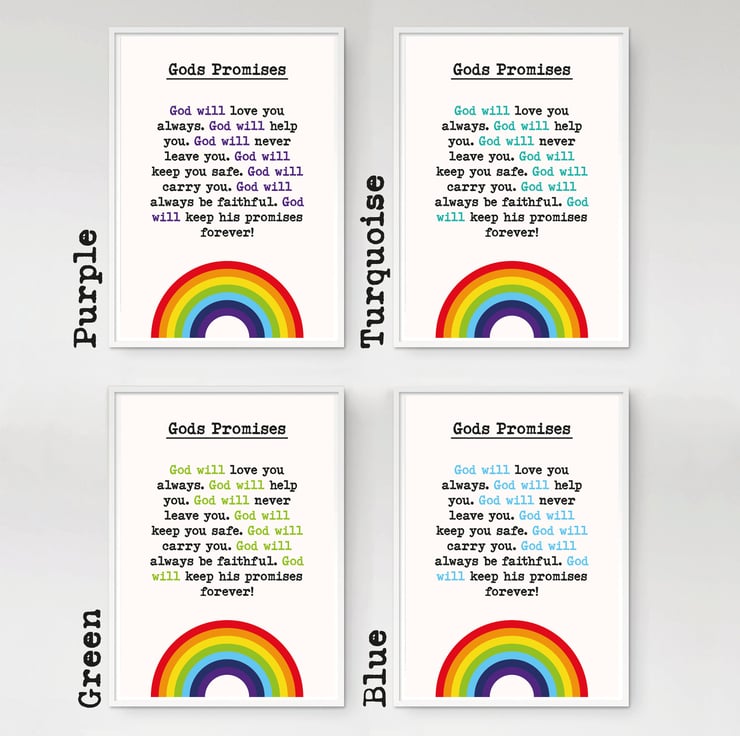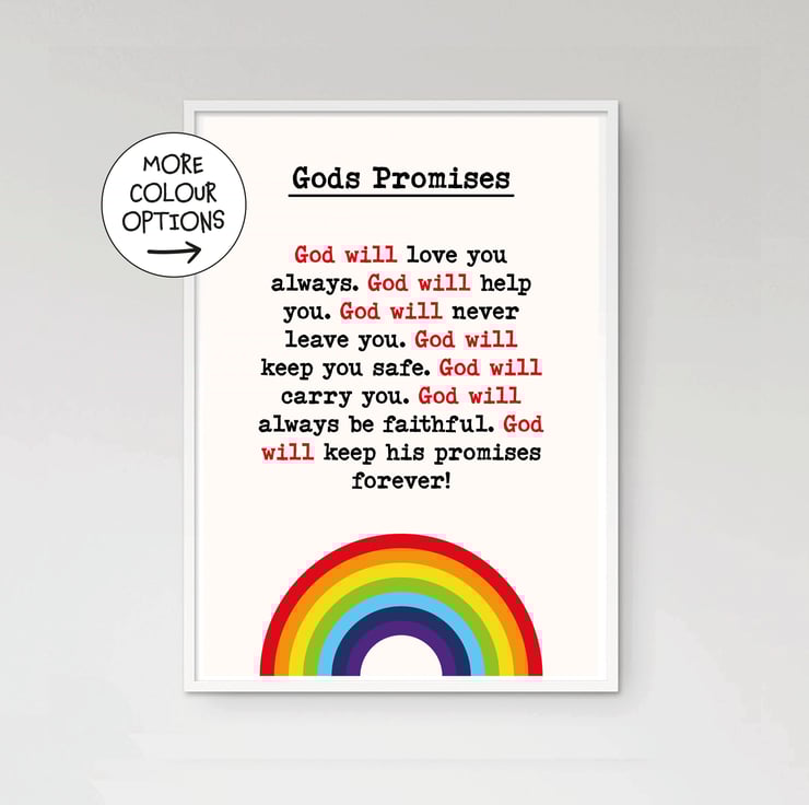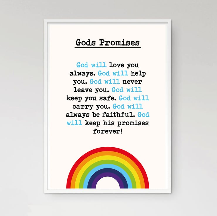 Fun & bright illustrated 'Gods Promises' print that will look great in any kids bedroom or nursery. A thoughtful gift for any new parents or even an encouragement to send to a loved one going through a tough time.