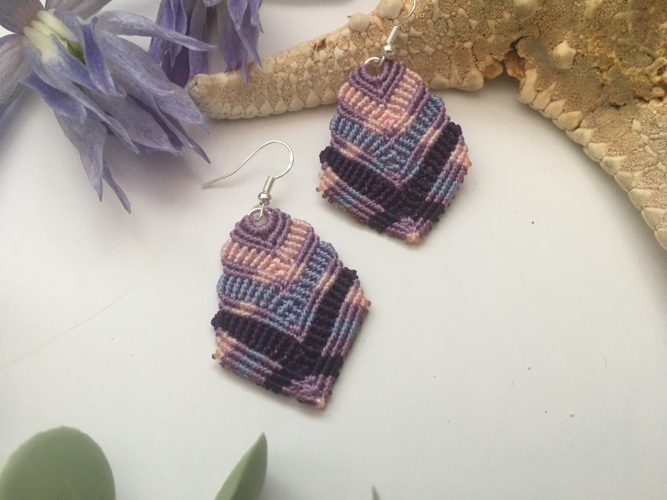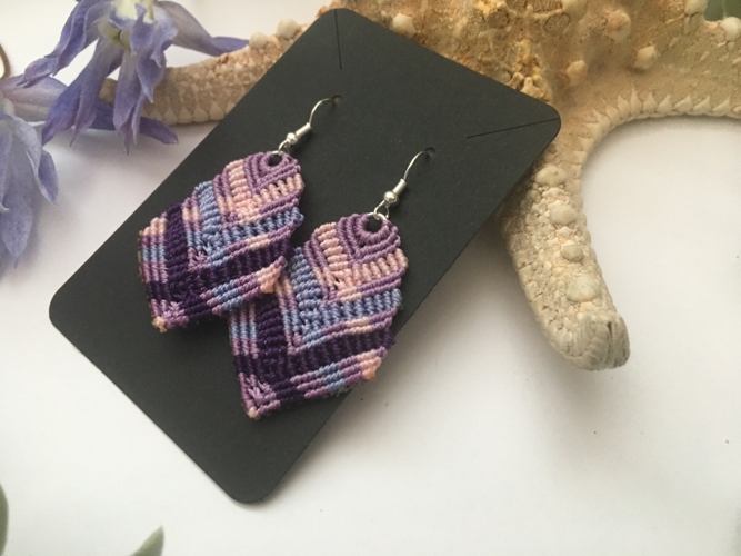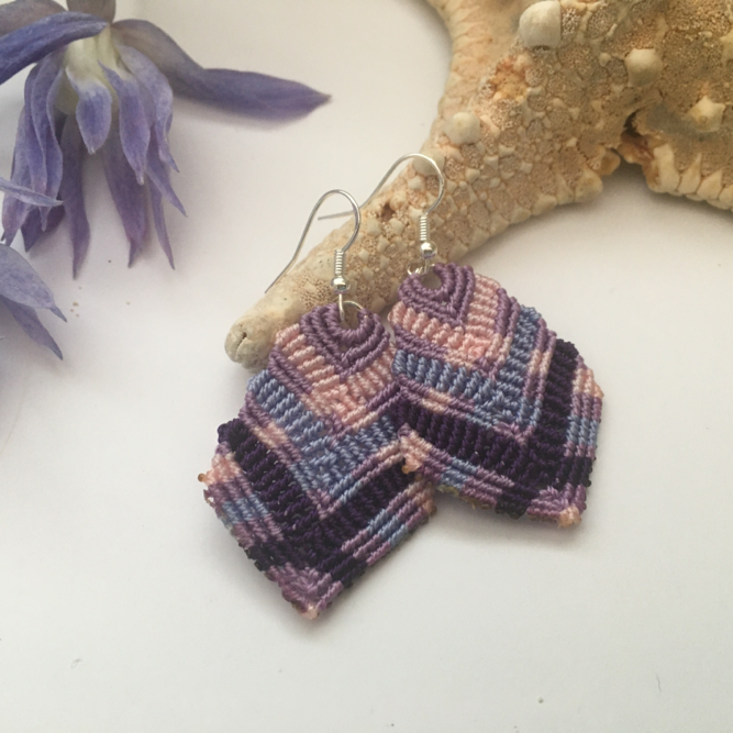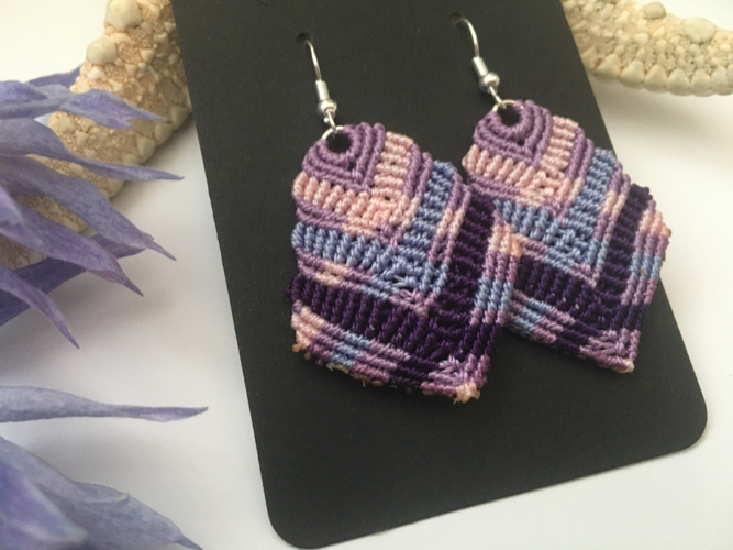 These pretty earrings are handmade using the delicate art of macrame. I have used extremely strong but light weight C Lon macrame thread in soft pastel shades of pink, lilac and purple , perfect to accessorize with a Summer dress or shorts.