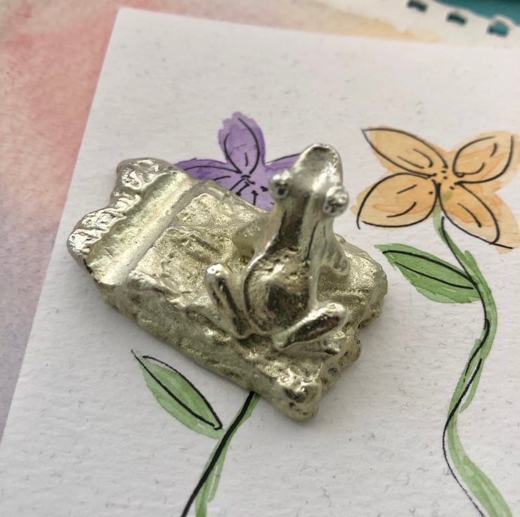 A cute solid pewter Frog on a Log figurine to rest your brush or pen.
