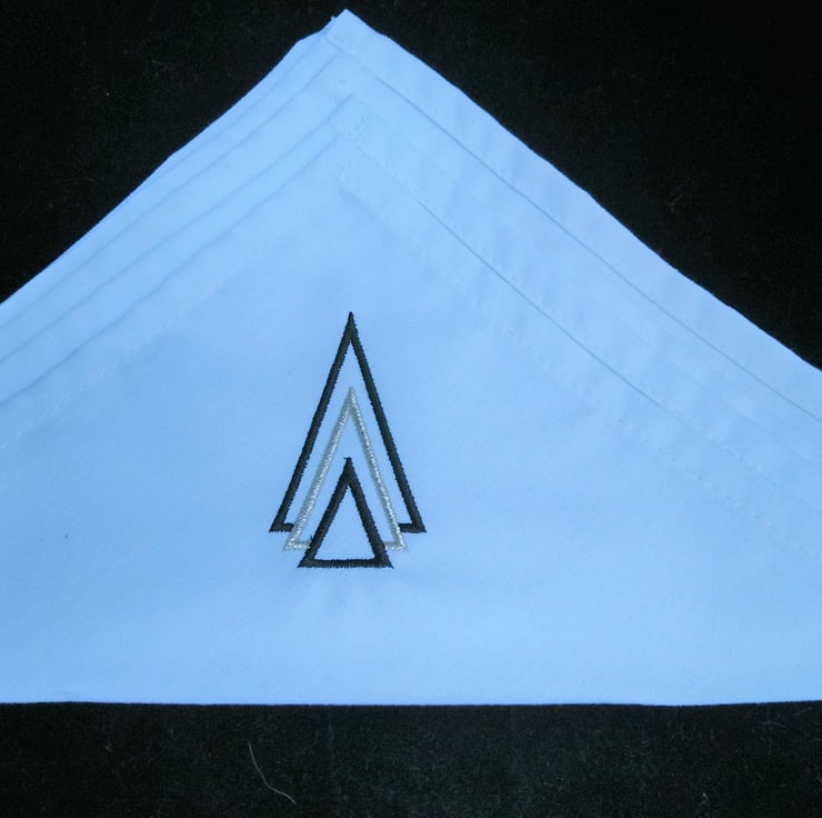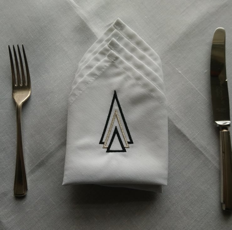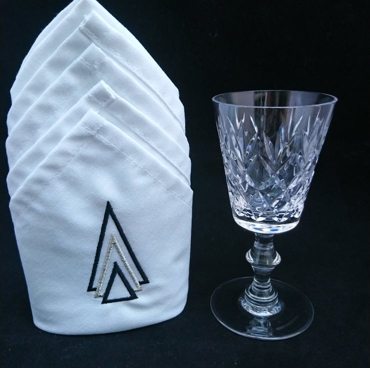 Deco Design Embroidered Napkins. These Napkins have been embroidered on Hotel Quality 100% Cotton Napkins. The designs have been designed by me, so they are one offs and unique. They are embroidered in one corner . They can stand or lay flat on the table. They come individually packed in self sealed bags