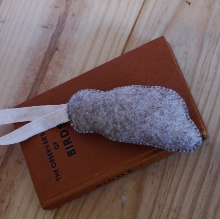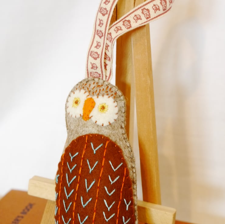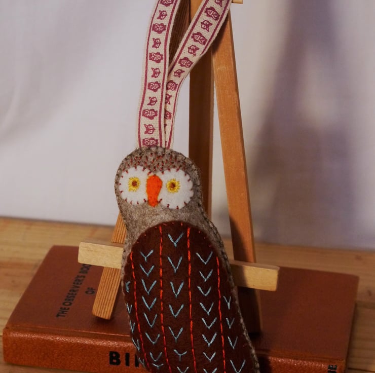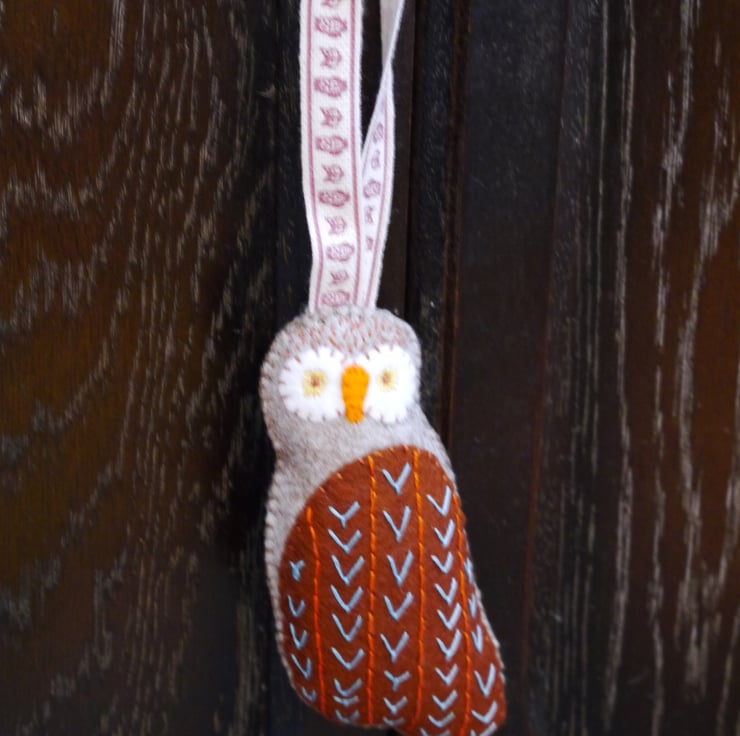 This woodland dweller has a whimsical feel about him with his inquisitive eyes and embroidered wing, set on a beautiful marl felt body and cute linen ribbon hanging loop. He is handstitched and lightly stuffed to give a pleasing shape. Measuring approximately two and a quarter inches (5.5cm) wide and four and a half inches (11.5cm) long excluding loop. He would make a lovely addition to any owl lovers collection (we all know one) hanging on a door or drawer handle of even the Christmas tree. Pattern inspiration and credit to Corinne Lapierre Designed as a decoration not a toy. Created in a smoke and pet free home.