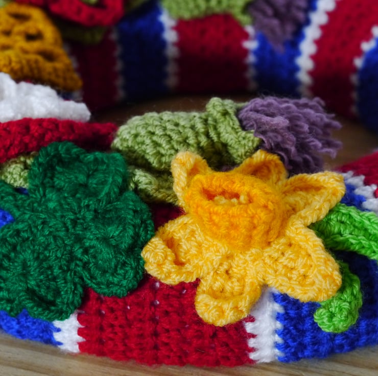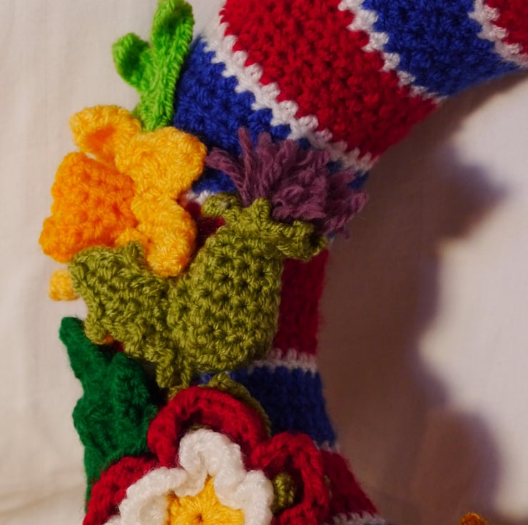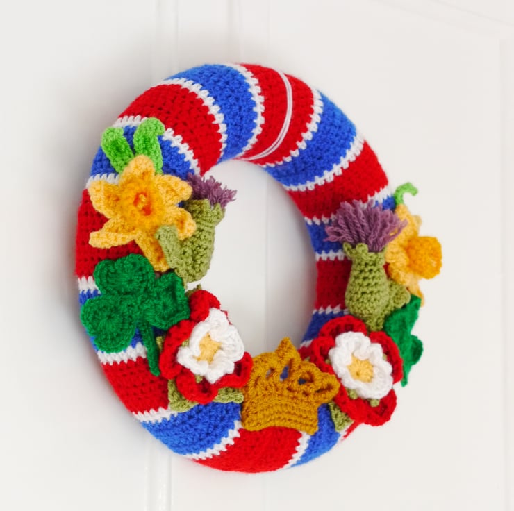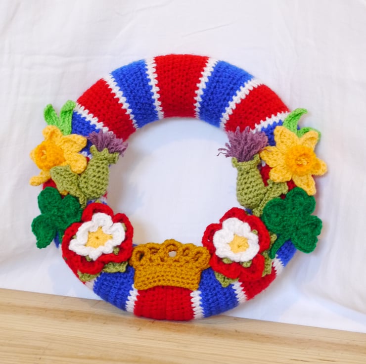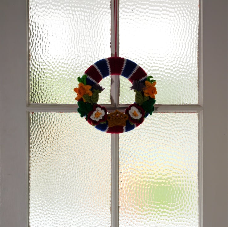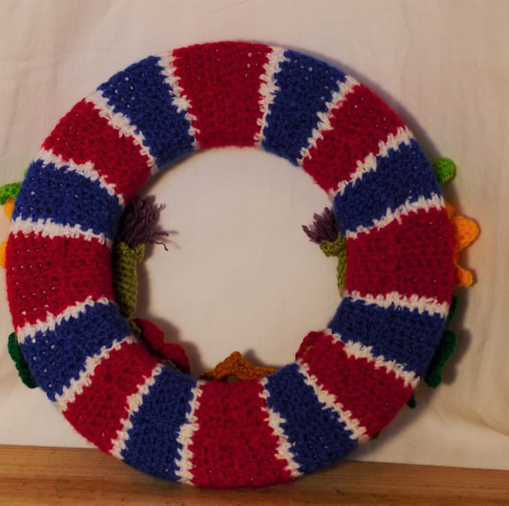 This crochet wreath has been created by covering a 25cm polystyrene wreath base with a specially designed striped cover to recreate the stripes of the national flag. Then adorned with crochet flowers representing the four nations and finished with a crown. All lovely crochet by myself. this one a kind item would make a lovely memento of this historic occasion. Designed as a decoration not a toy . Created in a smoke and pet free home.