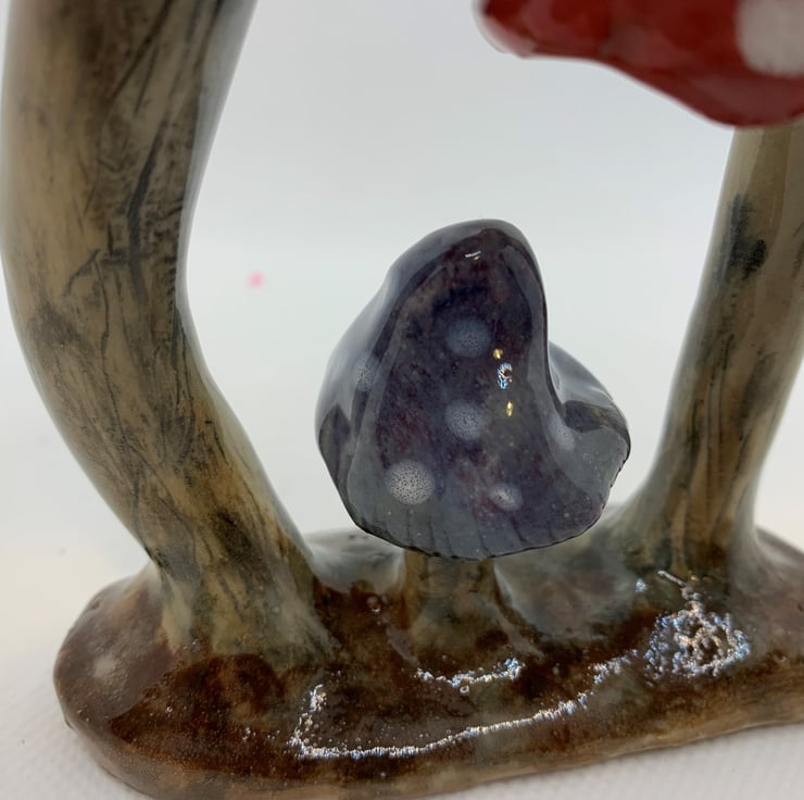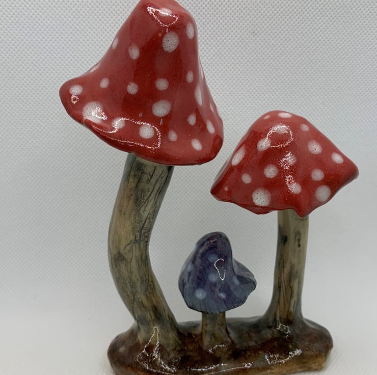 Two Fairy toadstools and a blue one combine to make this cute ornament. Suitable for indoor or outdoor use. Handbuilt in stoneware clay, handpainted and glazed. 5.5 ins high (14cms), 4ins (10cms) wide.