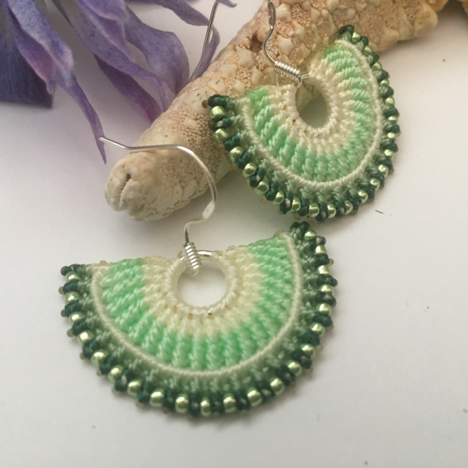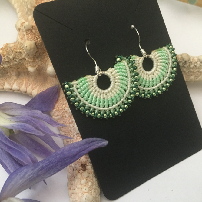 I have created these earrings using the intricate knotting art of macrame, using extremely strong C Lon thread in pretty fresh shades of green.