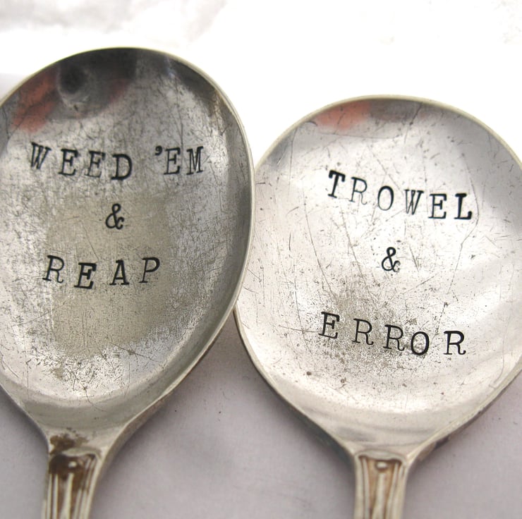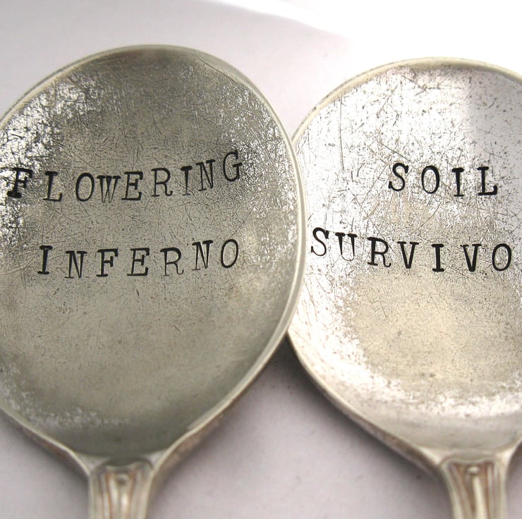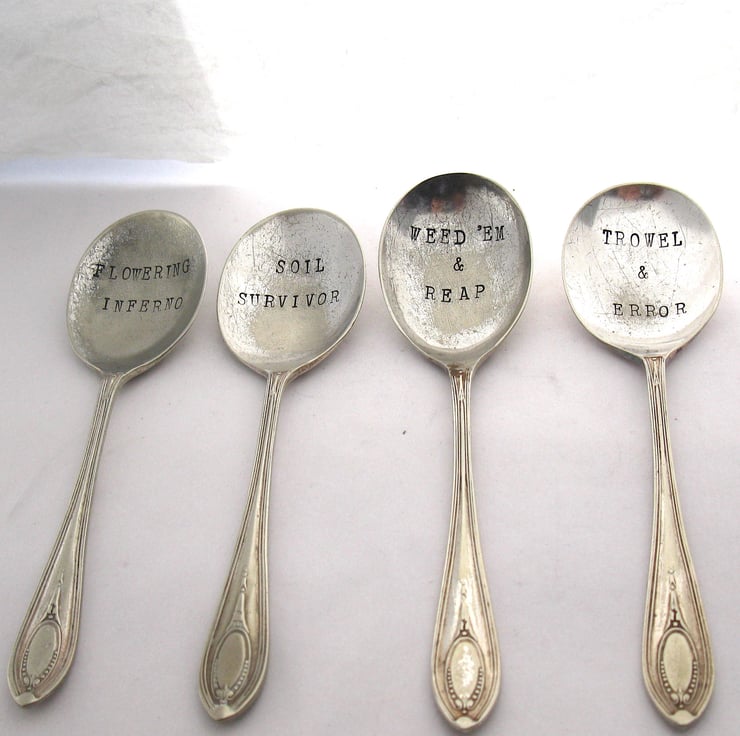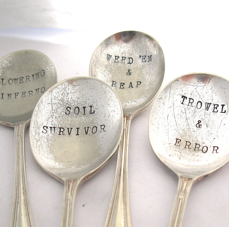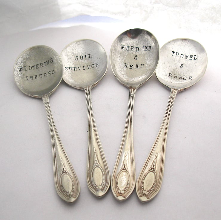Set of four more-or-less matching antique fruit spoons upcycled into plant labels that read FLOWERING INFERNO, TROWEL & ERROR, SOIL SURVIVOR and WEED 'EM & REAP. So whether you are optimistic or pessimistic about their respective futures, you'll be able to tell your seedlings apart!