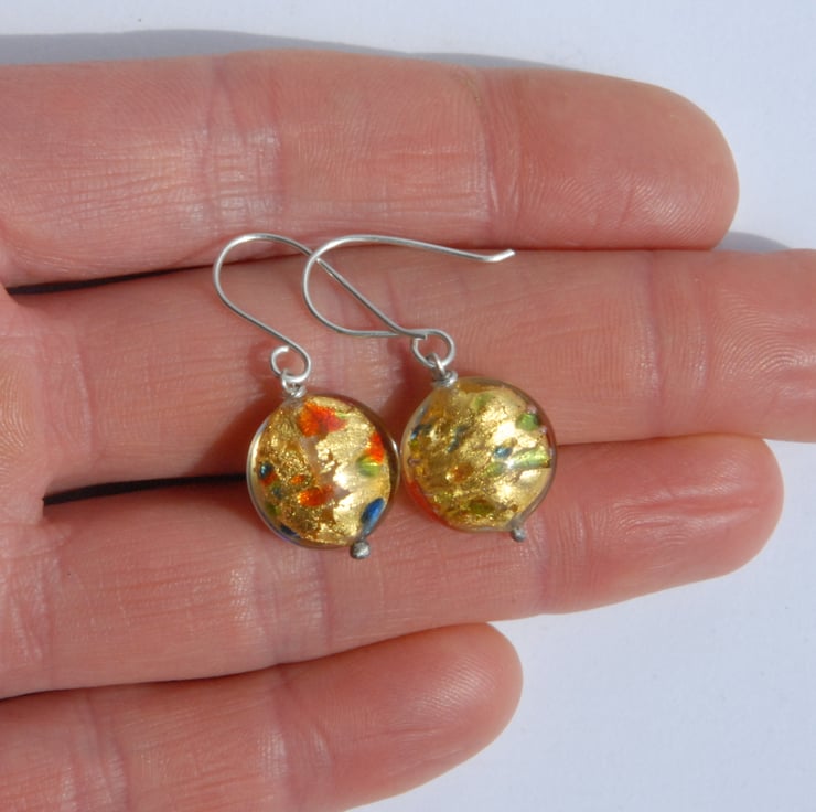 These vibrant drop earrings have golden Murano beads hanging from sterling silver hooks. The handmade beads have orange, green and blue speckles over a rich yellow gold foil center, these are not a large earring but have a lot of opulence to them. They are finished with simple hand made sterling silver hooks.