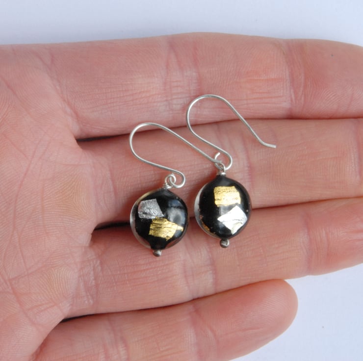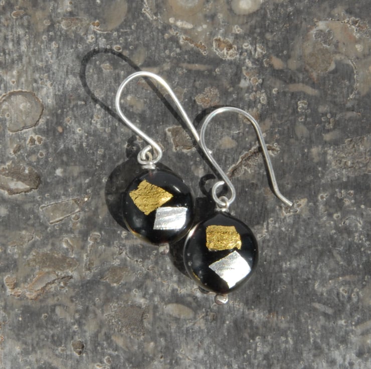 These simple drop earrings feature handmade murano glass beads suspended from handmade sterling silver hooks. The beads are lentil shaped (flattened spheres) with squares of silver and gold foil on a black base, the bead is encased in clear glass to protect the metal foils. the contrast of the silver and gold make these an eye catching earring without them being big or weighty.