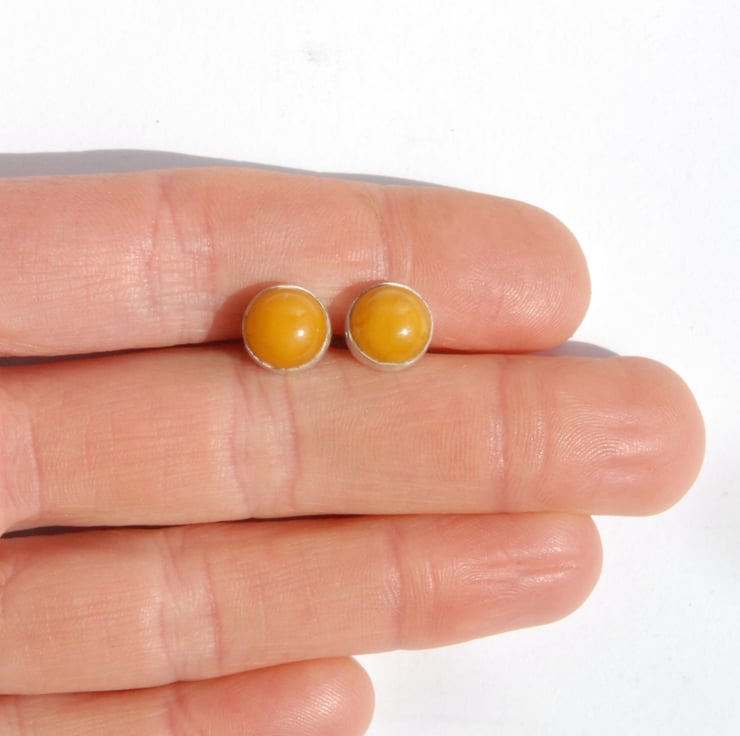 These round stud earrings feature egg yolk yellow cabochons of baltic amber bezel set in silver and finished with sterling silver posts and scrolls. The amber studs are made with butterscotch amber which is an opaque warm yellow orange colour, if you look very closely you can see a slight swirl in the material but don't expect any fossils! The amber it's came from a retired Polish jeweller who had recovered the cabochons from his own work when he retired and scraped his unsold stock. The studs measure approx 9mm diameter with a fairly high dome of 5mm (don't worry they aren't heavy and could comfortably be worn all day).