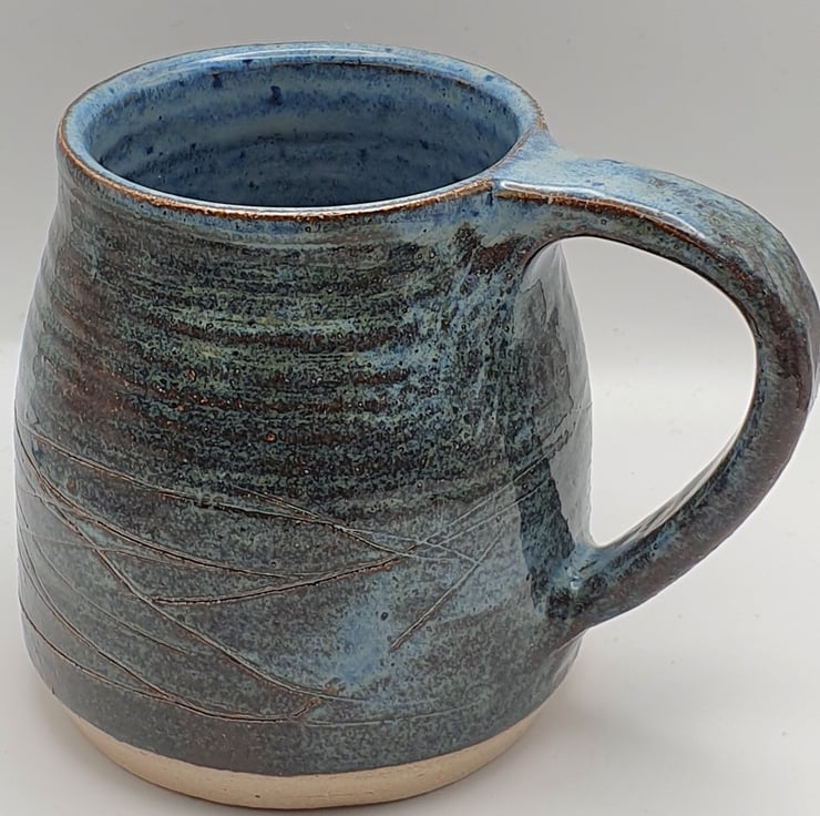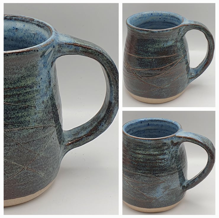 Mugs thrown on the potter's wheel. Each mug has carved line decoration and glazed in a blue- green colour. Note slight variations in shape and handles as hand made.