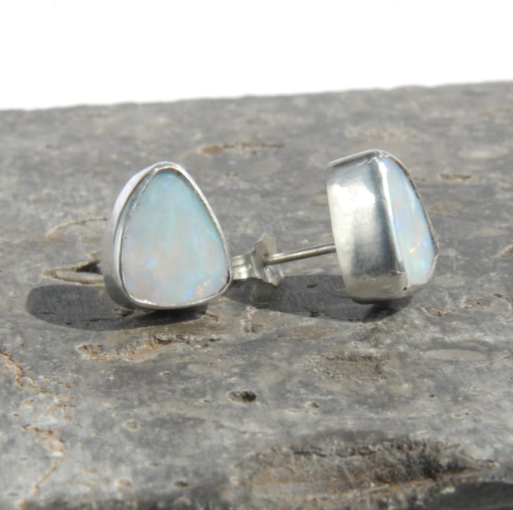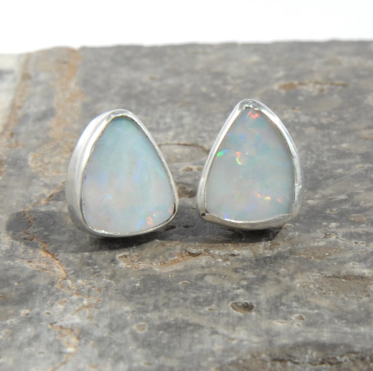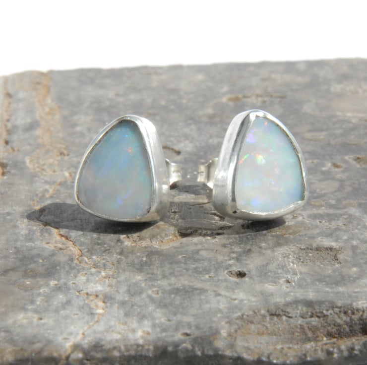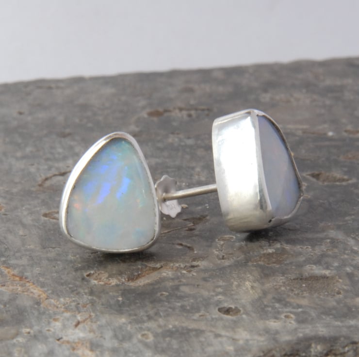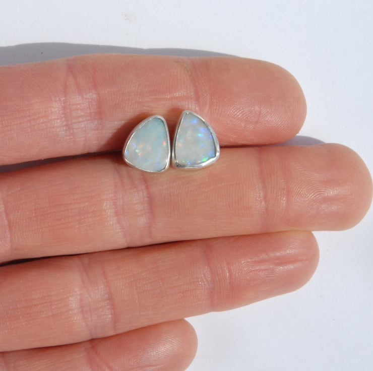 These sterling silver stud earrings feature smoothly bezel set Australian opal doublets finished off with sterling silver posts and scrolls. The opals have a pale grey body colour and show a full rainbow range of fire, mainly blue and purple with green and red as a minor component. They are backed with ironstone for strength but you can't see this due to the way they are set. The studs are a rounded triangle shape measuring approx 11mm by 9mm, these are quite deep stones (approx 4mm) but they are not heavy so comfy to be worn all day.