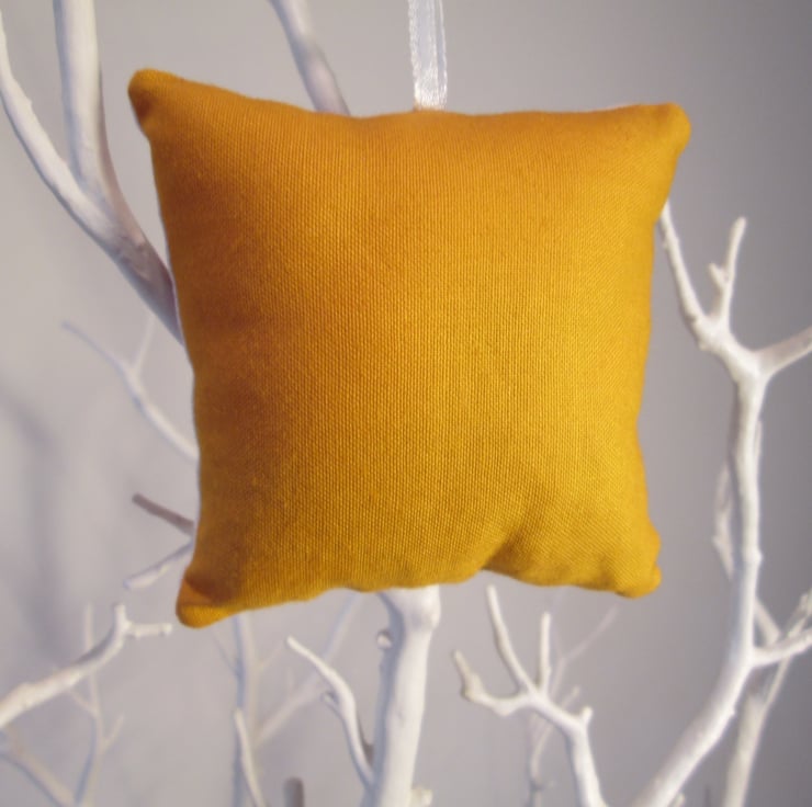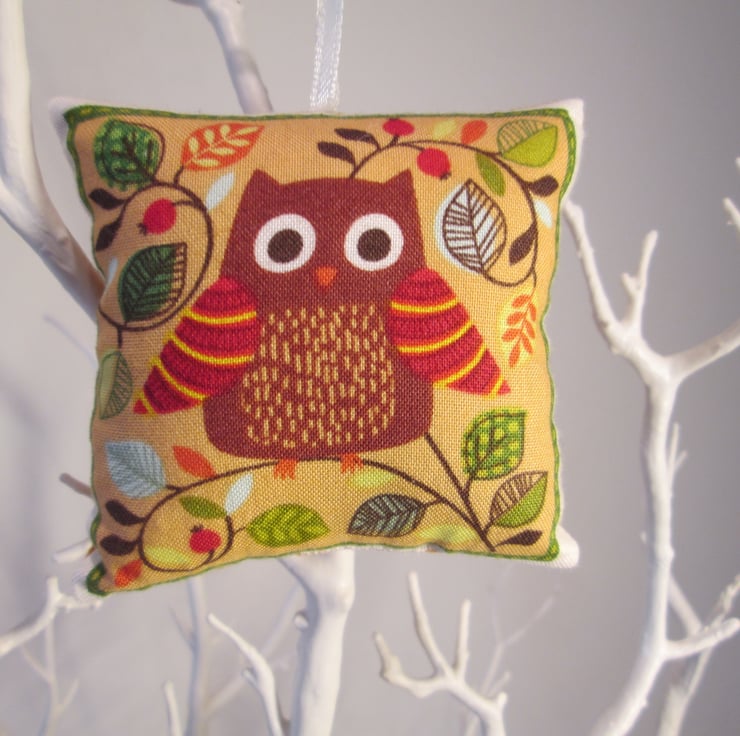 An adorable square pillow filled with English lavender and hollow-fibre stuffing just ideal for hanging anywhere as a decorative item or in a wardrobe or drawer as lavender is a renowned natural moth repellent. This lavender bag measures approximately three and a quarter inches (8.5 cm) square excluding hanging loop (3.5 in / 9 cm) and is filled to give a plump look. The front depicts owl and the back is plain orange with a hanging loop of cream satin ribbon. This quaint item has a lovely traditional scent and makes a lovely gift as well as something for yourself.