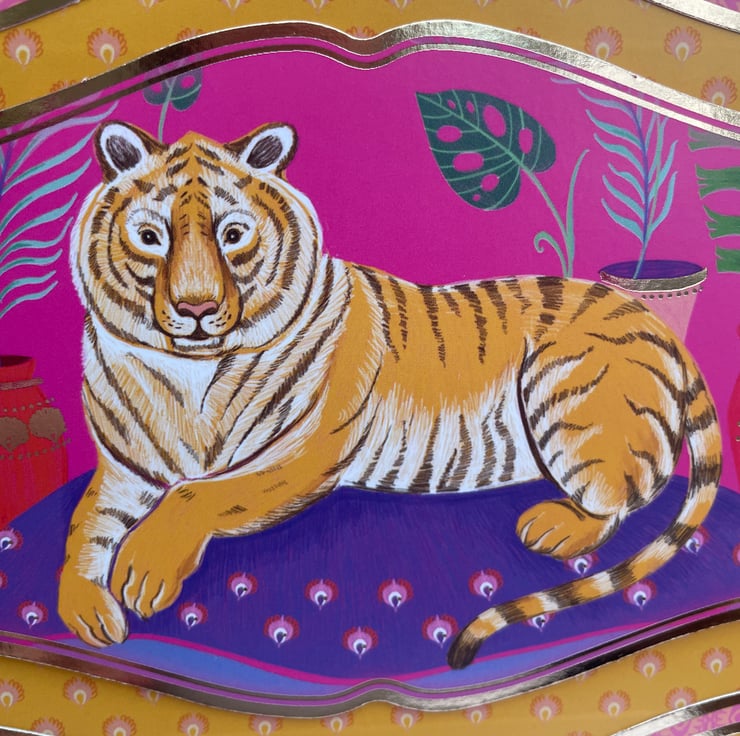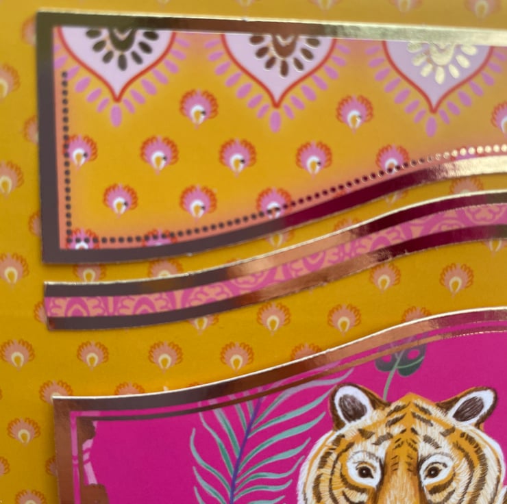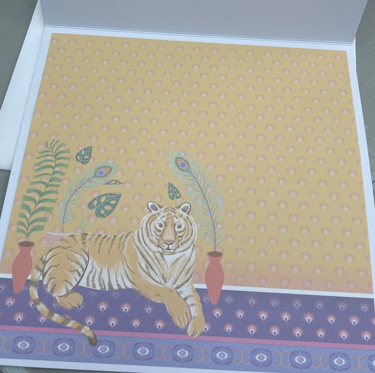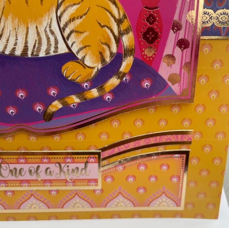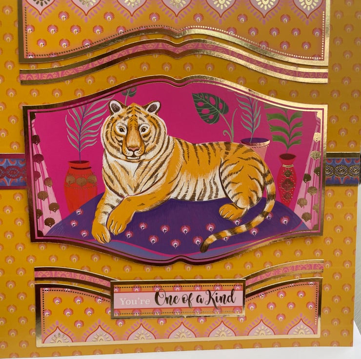 Exotic and beautiful. This 18x18cm card is definitely exotic in it's style. The background is a fabulous patterned paper in vibrant oranges and yellows. This is topped with a topper of a tiger lying on a purple carpet. This is surrounded by matching gold edged frames in yellow, oranges and pinks. The greeting says You're one of a kind so it lends itself to many occasions from birthday, thank you, just for you - anything you want. Inside the card has a matching insert with the tiger featured again.