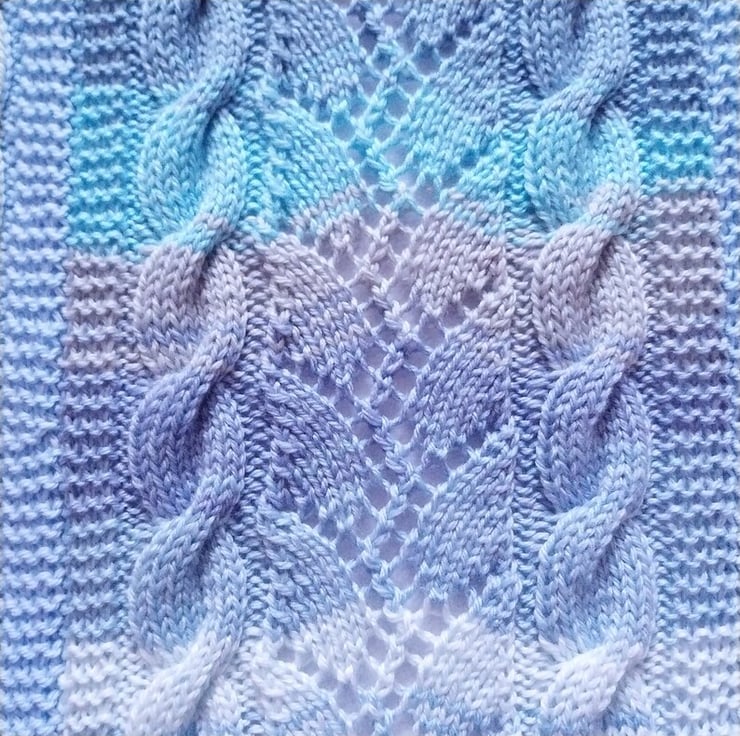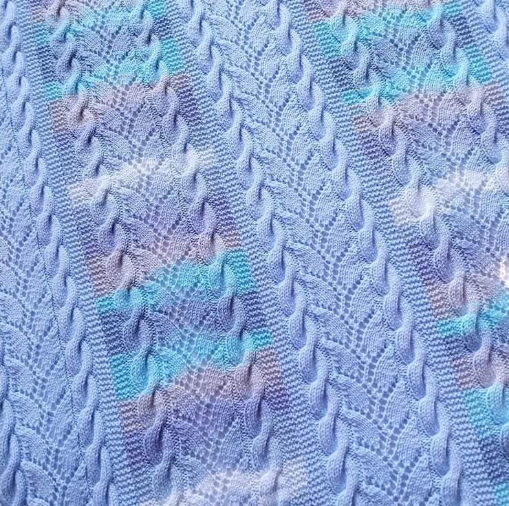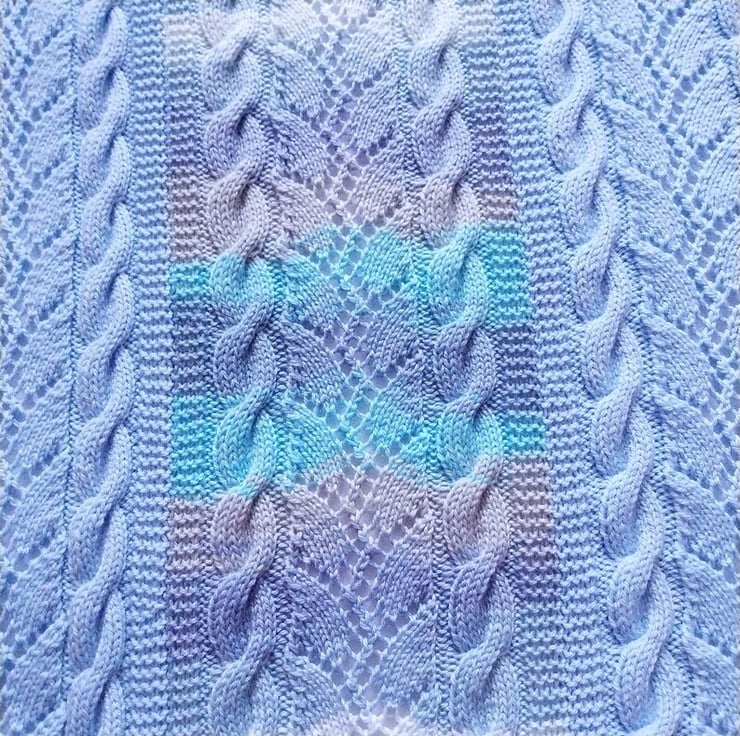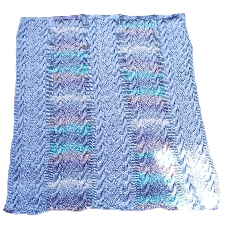 What sets this blanket apart is its distinct design, composed of five individual panels meticulously sewn together. Each panel alternates between solid baby blue and a multicolored yarn that gracefully transitions through various shades of blue and a subtle pale grey. The center of each panel features an eyelet pattern resembling delicate leaves, flanked by a beautifully intricate twisted cable. This cable is surrounded by a plain knit border, adding to the overall charm of this masterpiece.