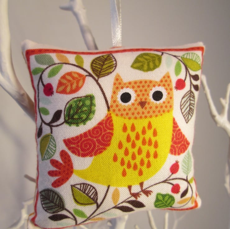 An adorable square pillow filled with English lavender and hollow-fibre stuffing just ideal for hanging anywhere as a decorative item or in a wardrobe or drawer as lavender is a renowned natural moth repellent. This lavender bag measures approximately three and a quarter inches (8.5 cm) square excluding hanging loop (3.5 in / 9 cm) and is pleasingly filled to give a plump look. The front depicts an owl and the back is plain orange with a hanging loop of cream satin ribbon. This quaint item has a lovely traditional scent and makes a lovely gift as well as something for yourself.