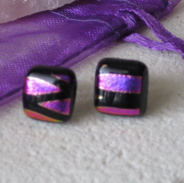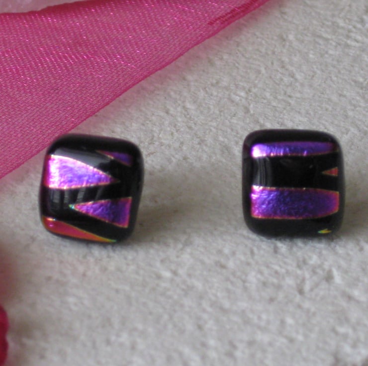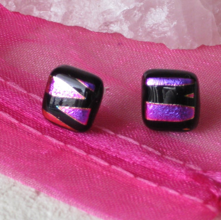 A pair of hot pink on black - 10mm square dichroic on Bullseye stud earrings. Handmade from quality glass. Created by kiln fusion. Sterling silver ear posts with soft rubber hypoallergenic safety stoppers.