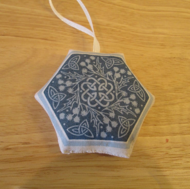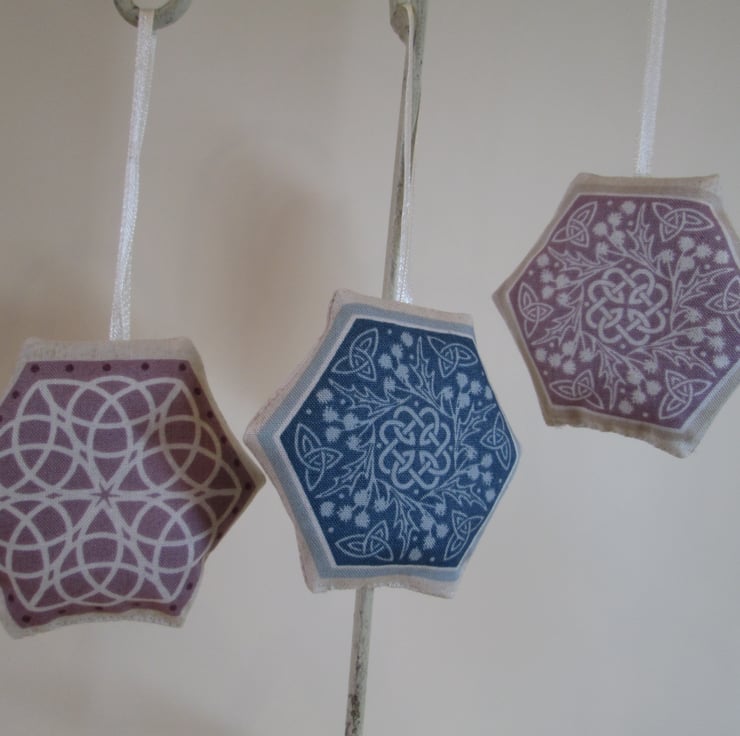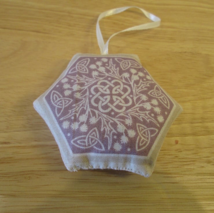 These three Celtic themed lavender bags would make a lovely gift for any friend or relative, or as a treat for yourself. They are both practical and pretty and could be hung anywhere. Each pillow is filled with English lavender and measures approximately three and a quarter inches (8.5 cm) at its widest part. Each lavender bag has a Celtic pattern on the front and a patterned back with a hanging loop of narrow satin ribbon (3.5 in / 9 cm).