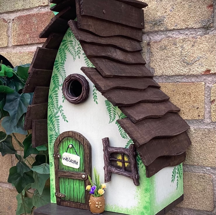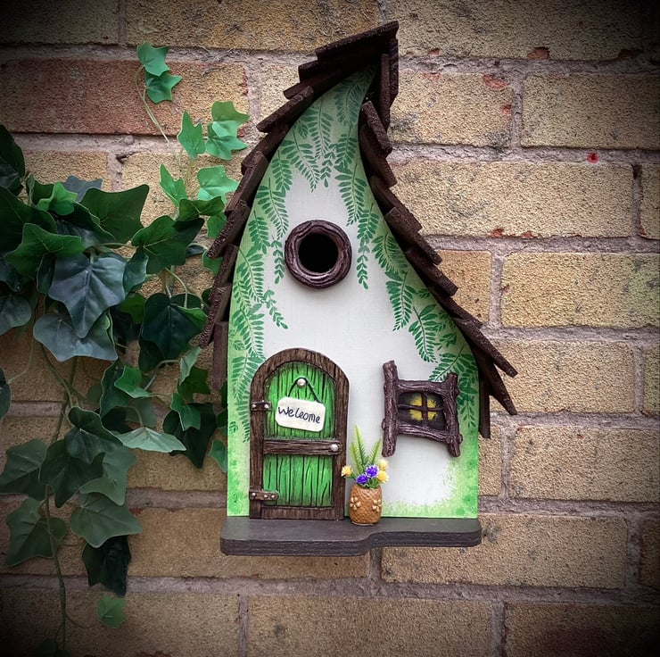 A beautiful Bird House hand painted with ferns cascading from the roof of this magical fairy bird house.